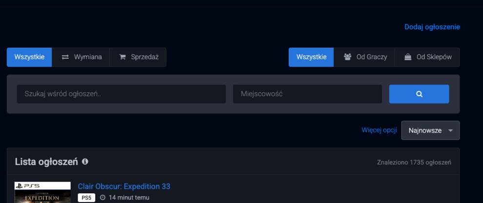 1) Na liście ogłoszeń możesz wybrać czy chcesz widzieć ogłoszenia "Wszystkie", "Od Graczy" lub "Od Sklepów":