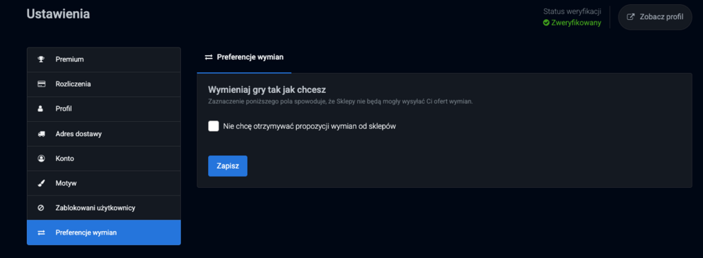 2) W Ustawieniach w sekcji "Preferencje wymian" możesz na stałe zablokować możliwość otrzymywania propozycji od Sklepów: