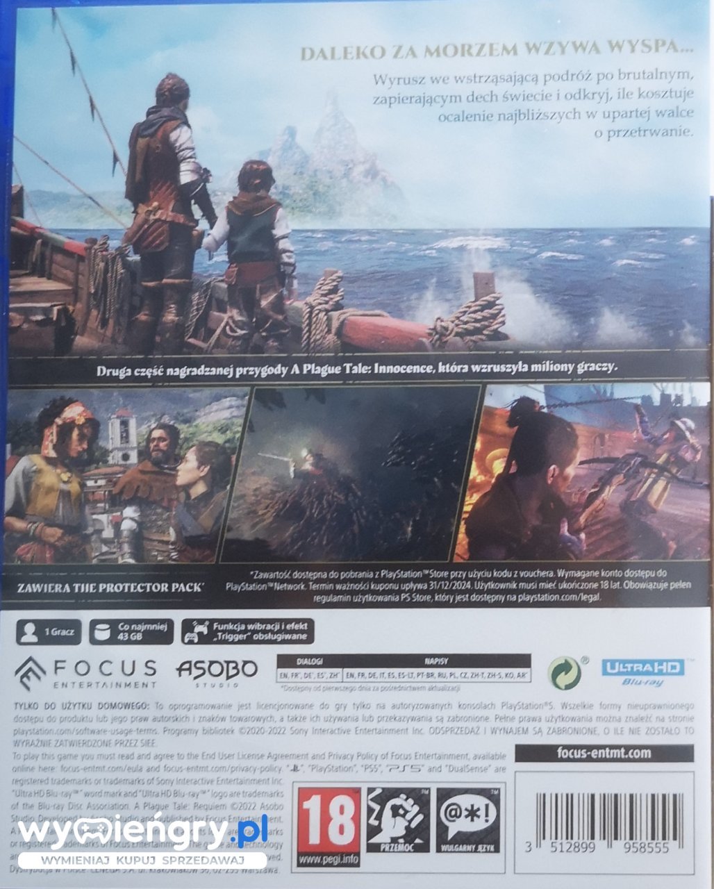 A Plague Tale: Requiem to kontynuacja ciepło przyjętej przygodowej gry akcji z wyraźnie zarysowanymi elementami skradanki, wydanej w 2019 roku. Produkcja została opracowana przez autorów pierwszej części serii, czyli zespół Asobo Studio, a jej wydaniem zajęła się firma Focus Home Interactive. A Plague Tale: Requiem ponownie zabiera nas do średniowiecznej Europy. Akcję tej produkcji osadzono w XIV wieku, po wydarzeniach przedstawionych w pierwowzorze. Plaga, która nawiedziła Francję, jeszcze się nie skończyła, podobnie jak rozdzierające kraj wojny. Amicia i Hugo, czyli rodzeństwo znane z oryginału, wraz z przyjaciółmi ponownie muszą stawić czoła przeciwnościom losu i zawalczyć o swoje życie. Fizyczna wersja gry A Plague Tale: Requiem zawiera dodatek DLC Protector Pack! Wyrusz przygotowany w kolejnym rozdziale podróży Amicii i Hugo dzięki specjalnej skórce do kuszy, ekskluzywnym dodatkom kosmetycznym dla Amicii oraz dodatkowym materiałom do craftingu.