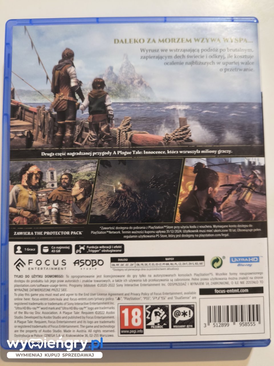 A Plague Tale: Requiem to kontynuacja ciepło przyjętej przygodowej gry akcji z wyraźnie zarysowanymi elementami skradanki, wydanej w 2019 roku. Produkcja została opracowana przez autorów pierwszej części serii, czyli zespół Asobo Studio, a jej wydaniem zajęła się firma Focus Home Interactive. A Plague Tale: Requiem ponownie zabiera nas do średniowiecznej Europy. Akcję tej produkcji osadzono w XIV wieku, po wydarzeniach przedstawionych w pierwowzorze. Plaga, która nawiedziła Francję, jeszcze się nie skończyła, podobnie jak rozdzierające kraj wojny. Amicia i Hugo, czyli rodzeństwo znane z oryginału, wraz z przyjaciółmi ponownie muszą stawić czoła przeciwnościom losu i zawalczyć o swoje życie. Fizyczna wersja gry A Plague Tale: Requiem zawiera dodatek DLC Protector Pack! Wyrusz przygotowany w kolejnym rozdziale podróży Amicii i Hugo dzięki specjalnej skórce do kuszy, ekskluzywnym dodatkom kosmetycznym dla Amicii oraz dodatkowym materiałom do craftingu.