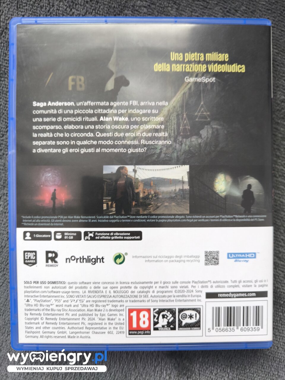 Alan Wake 2 to survival horror będący bezpośrednią kontynuacją gry z 2010 roku. Produkcja ponownie pozwala nam przenieść się do miasteczka Bright Falls i wraz z dwójką grywalnych postaci (tytułowym bohaterem i agentką FBI Sagą Anderson) stanąć do walki z mrocznymi siłami. Produkcja zabiera nas na północno-zachodnie wybrzeże Stanów Zjednoczonych, do miasteczka Bright Falls w stanie Waszyngton – tym pozornie idyllicznym miejscem wstrząsa fala zbrodni na tle rytualnym. Na miejsce wysłana zostaje Saga Anderson, profilerka FBI, która jest ekspertką od spraw trudnych do rozwiązania. Alan Wake 2 Deluxe Edition zawiera następujące elementy: Gra Alan Wake 2 w wersji fizycznej, DLC „Night Springs” i „Lake House”, Kosmetyczne DLC oraz Gra Alan Wake Remastered (Wydanie cyfrowe).