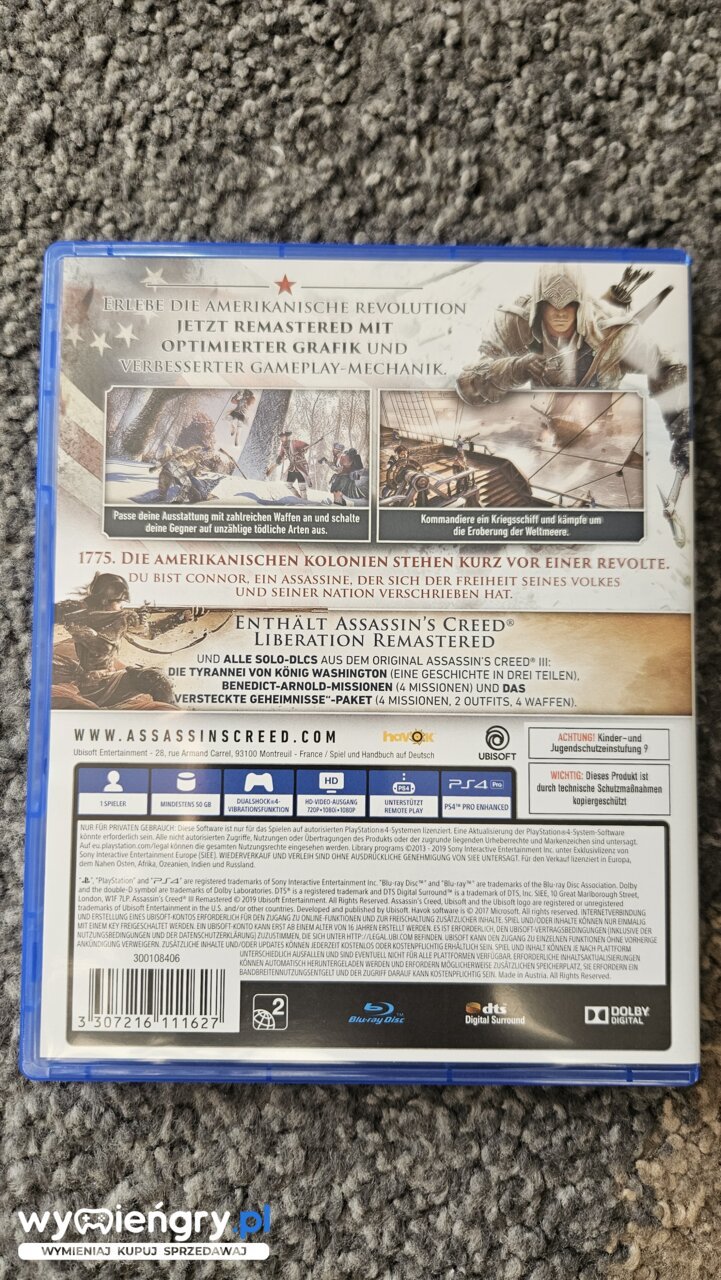 Rozpal płomień rewolucji wcielając się w postać mistrza Asasynów żyjącego w pięknej i brutalnej Ameryce XVIII wieku. Gra Assassin’s Creed III została zremasterowana w wersjach na PlayStation 4, Xbox One oraz komputery PC. Assassin’s Creed® III Remastered zawiera też grę Assassin’s Creed Liberation Remastered, która opowiada o niezapomnianej podróży, jaka zawiodła Aveline od zatłoczonych ulic Nowego Orleanu, aż po tętniące magią voodoo bagna i starożytne ruiny Majów. Oprócz tego gra obejmuje też wszystkie dodatki DLC znane z oryginału, czyli „Misje Benedicta Arnolda”, „Ukryte tajemnice” oraz „Tyranię króla Waszyngtona”.