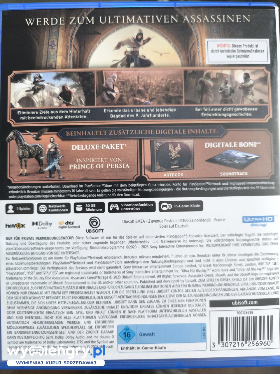 Poznaj historię Basima, sprytnego złodziejaszka doznającego koszmarnych wizji i poszukującego odpowiedzi oraz sprawiedliwości na gwarnych ulicach Bagdadu z dziewiątego wieku. Tajemnicza pradawna organizacja znana jako Ukryci pomoże mu stać się zabójcą doskonałym i odmienić swój los w sposób, jakiego nie byłby sobie nawet w stanie wyobrazić. Edycja Deluxe Assassin's Creed® Mirage, zawiera pełną wersję gry oraz: Edycja deluxe: strój inspirowany grą Prince of Persia, skórki dla orła oraz wierzchowca, broń i nie tylko! Zawartość bonusowa**: cyfrowy artbook i cyfrowa ścieżka dźwiękowa.