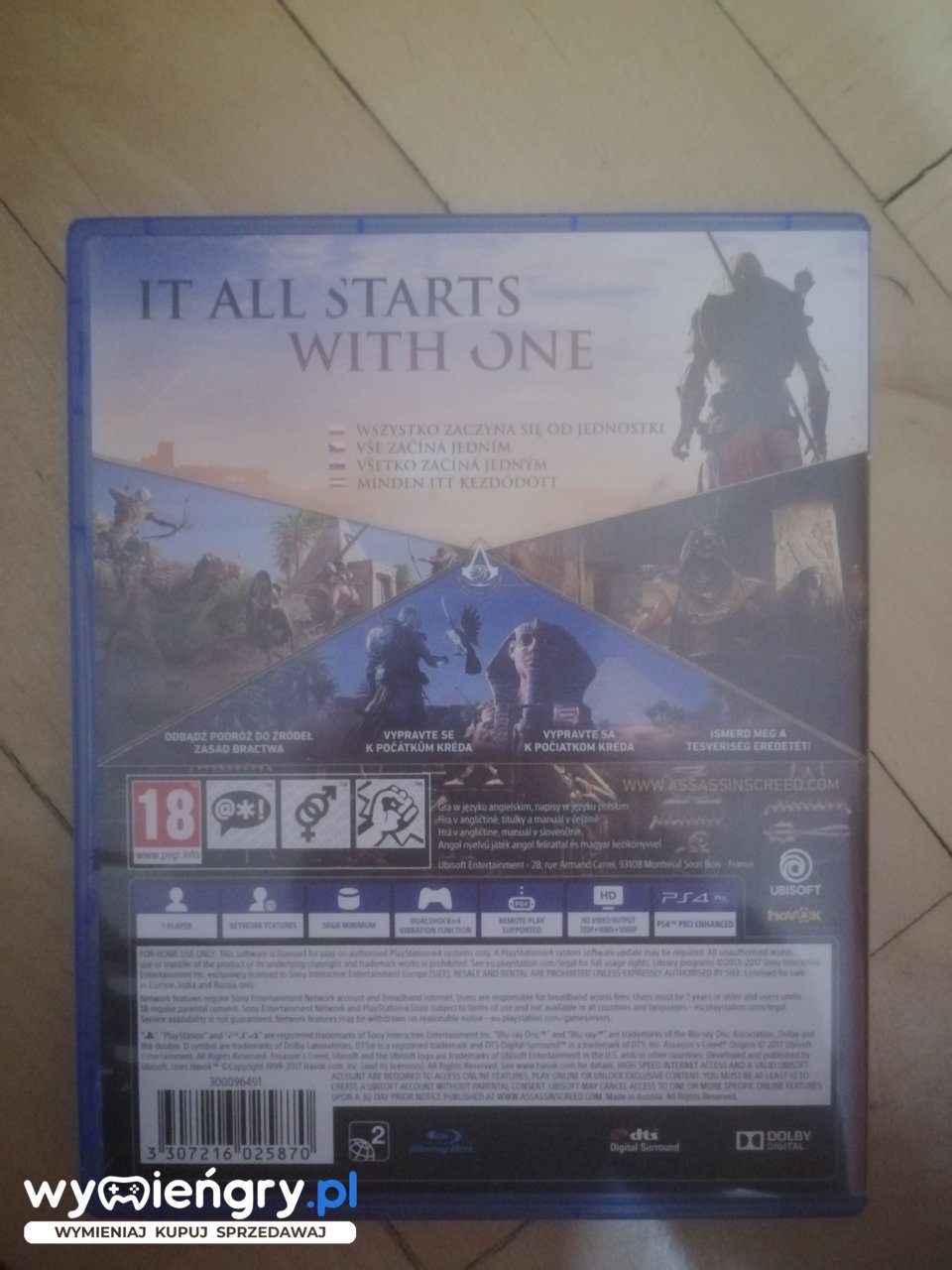 Kolejna odsłona bestsellerowego cyklu, stanowiąca niejako nowe otwarcie dla serii. Dzieło firmy Ubisoft przenosi graczy do starożytnego Egiptu, gdzie swoje początki miało bractwo tytułowych Asasynów. Starożytny Egipt, kraina bogów i przyziemnych intryg, staje się areną bezlitosnej walki o władzę. Odkryj mroczne sekrety i zapomniane podania, dzięki którym staniesz się najważniejszą postacią w dziele założenia Bractwa Asasynów.
