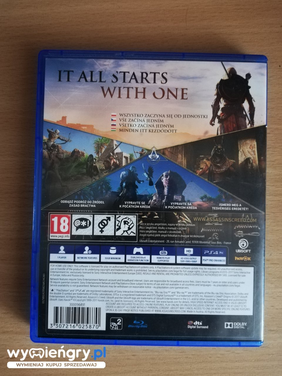 Kolejna odsłona bestsellerowego cyklu, stanowiąca niejako nowe otwarcie dla serii. Dzieło firmy Ubisoft przenosi graczy do starożytnego Egiptu, gdzie swoje początki miało bractwo tytułowych Asasynów. Starożytny Egipt, kraina bogów i przyziemnych intryg, staje się areną bezlitosnej walki o władzę. Odkryj mroczne sekrety i zapomniane podania, dzięki którym staniesz się najważniejszą postacią w dziele założenia Bractwa Asasynów.