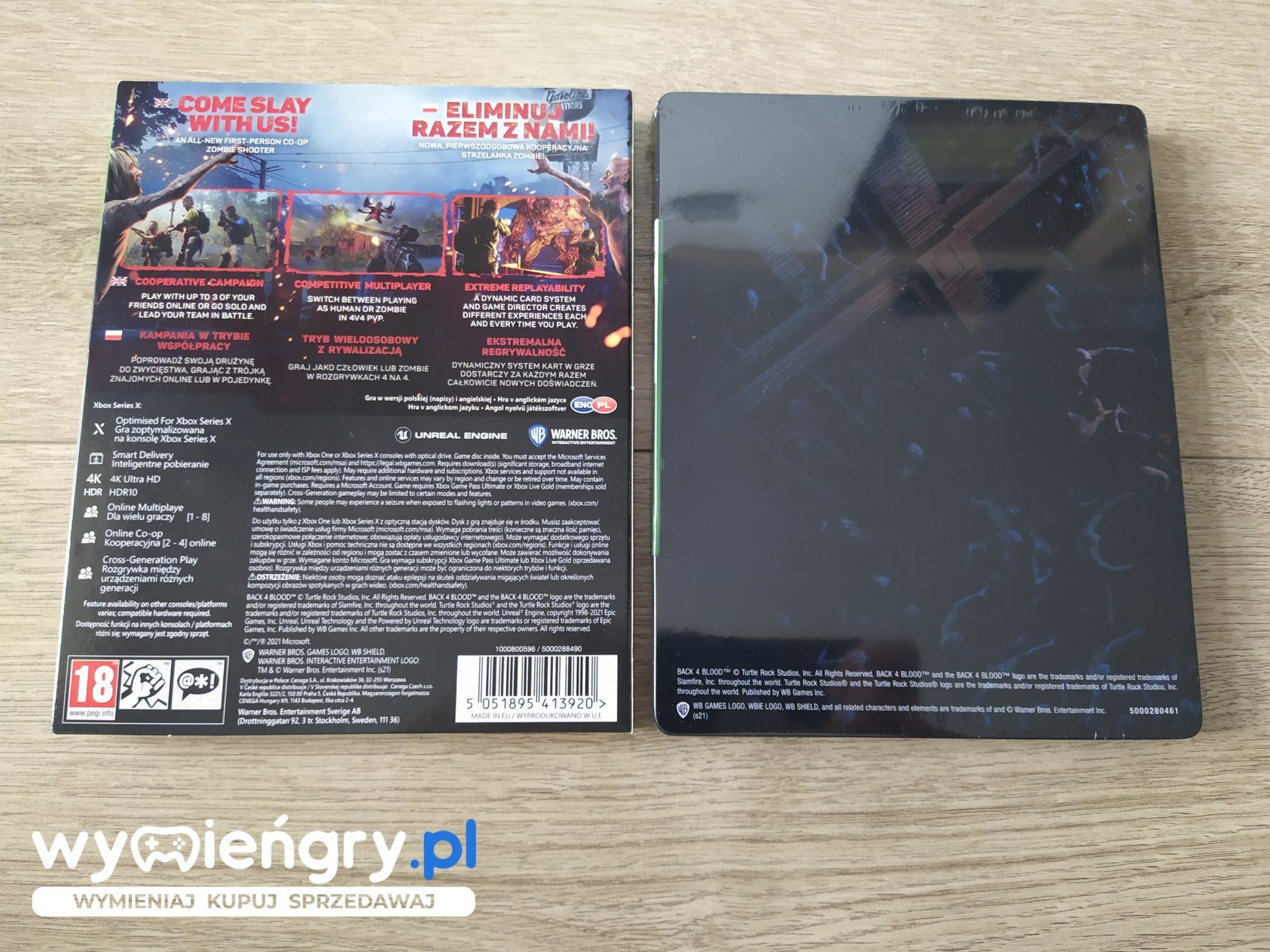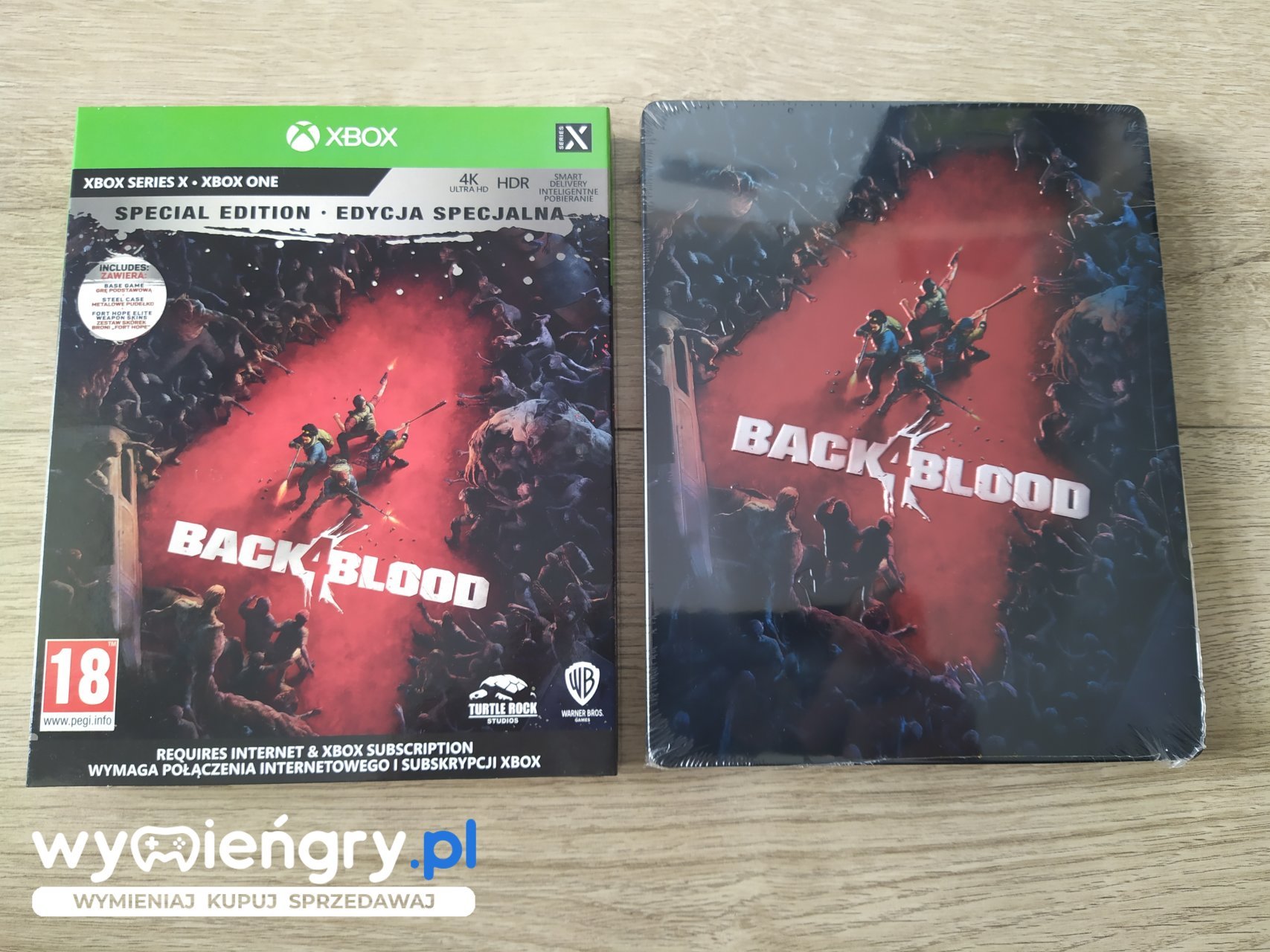 Kooperacyjna strzelanka FPP, w której gracze trafiają do świata opanowanego przez zombie. Back 4 Blood jest dziełem zespołu Turtle Rock Studios, który wcześniej stworzył między innymi takie pozycje jak Evolve czy bestsellerowe Left 4 Dead. Światem wstrząsa katastrofa. W wyniku epidemii wywołanej śmiercionośnym pasożytem wyginęła znaczna część ludzkiej populacji. Miasta zostały ponadto opanowane przez Ridden – żywicieli pasożyta, przeobrażającego ich w potworne, siejące zniszczenie kreatury. Grupka ocalałych, zwana „czyścicielami”, postanawia wspólnie stawić czoła hordzie wygłodniałych zombiaków i odzyskać chylącą się ku zagładzie cywilizację. Edycja Specjalna zawiera: Grę Back 4 Blood oraz Ekskluzywne metalowe opakowanie,