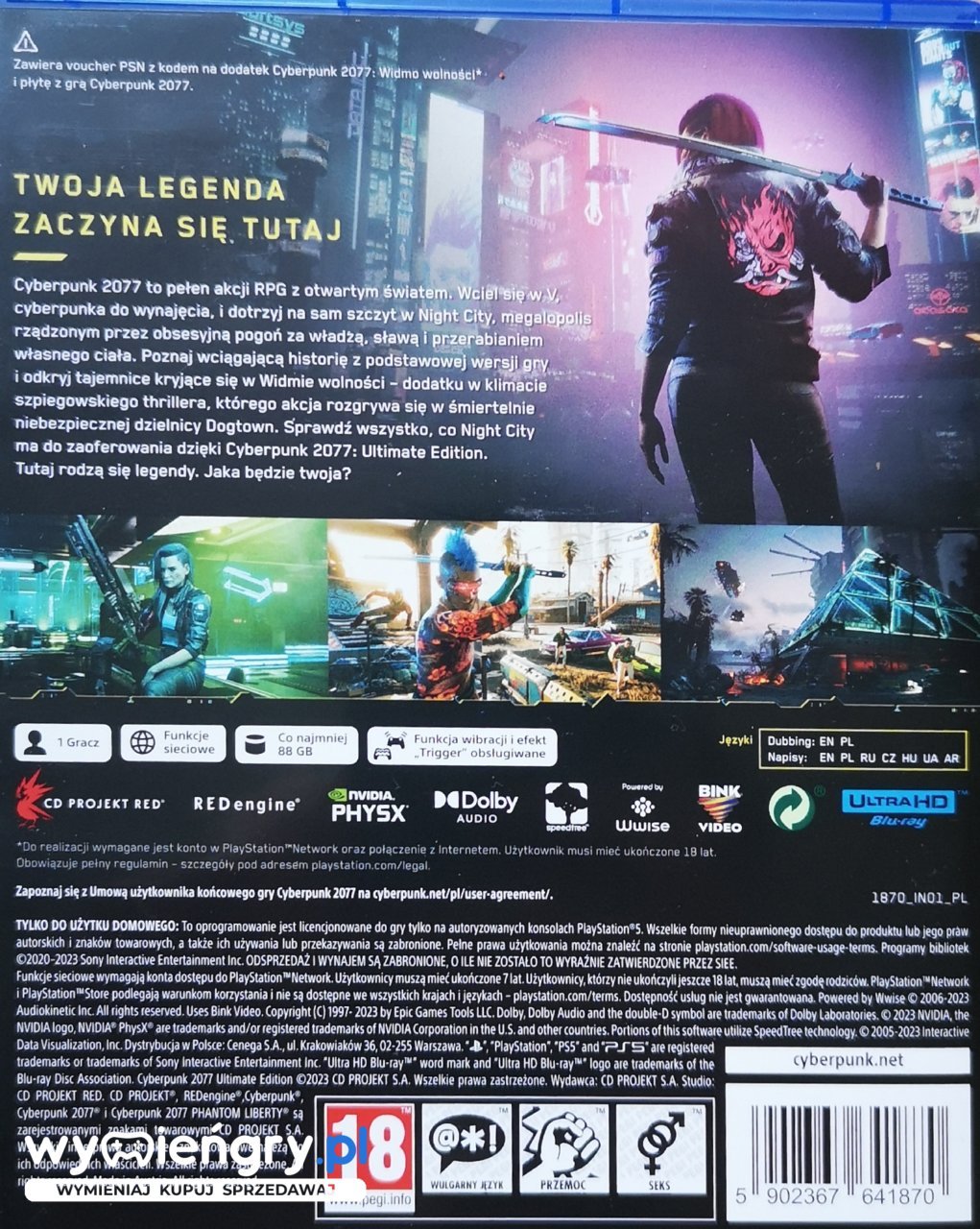 Cyberpunk 2077: Ultimate Edition to kompletne wydanie Cyberpunka 2077, czyli bestsellerowej gry RPG, opracowanej przez polskie studio CD Projekt RED. Zestaw zawiera podstawową wersję tej produkcji, rozszerzenie Cyberpunk 2077: Widmo wolności i wszystkie darmowe dodatki dostępne w momencie premiery pakietu, a także Aktualizację 2.0. Gra podstawowa Cyberpunk 2077 znajduje się na płycie BD, a dodatek Widmo Wolności w formie kodu aktywacyjnego. Cyberpunk 2077 to pełen akcji RPG z otwartym światem. Wciel się w V, cyberpunka do wynajęcia, i dotrzyj na sam szczyt Night City, megalopolis rządzonym przez obsesyjną pogoń za władzą, sławą i przerabianiem własnego ciała. Tutaj rodzą się legendy. Jaka będzie twoja?