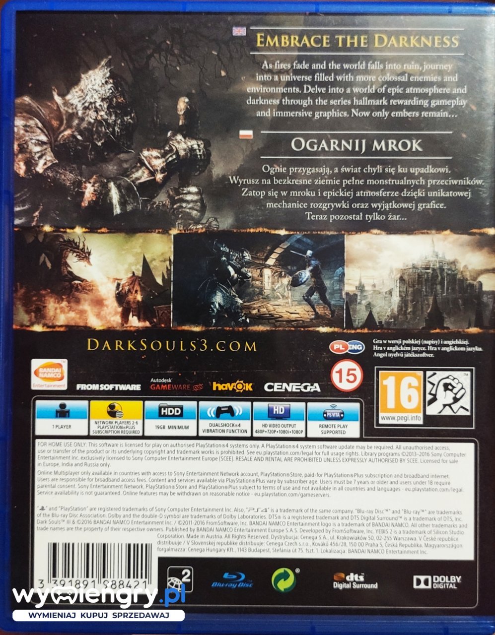 Dark Souls III to gra z gatunku Action-RPG, której poprzednie części wsławiły się niezwykle udaną mieszanką walki wręcz i użycia czarów z elementami RPG oraz niespotykanym poziomem trudności. Nowa, mroczna, apokaliptyczna podróż odkryje przed fanami ostateczne sekrety wyjątkowego świata, stworzonego przez Hidetakę Miyazaki, From Software oraz BANDAI NAMCO Entertainment! Gracze poddawani nieustającym wyzwaniom będą poruszać się po wielu lokacjach w poszukiwaniu sposobu, aby przetrwać nadchodzącą apokalipsę.