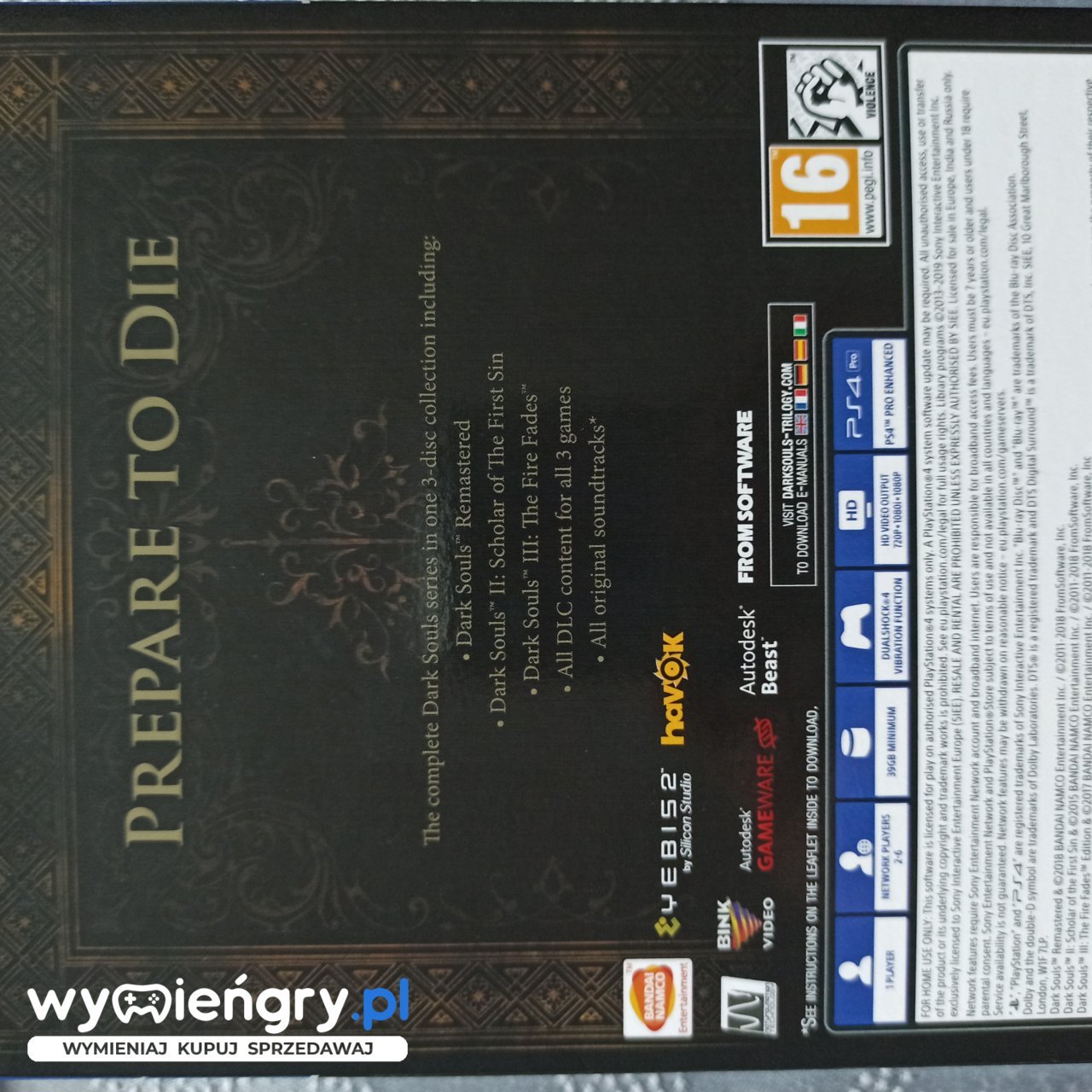 Zanurz się w mrocznym świecie Dark Souls Trilogy i staw czoła swoim najgłębszym lękom. W tej pełnej wyzwań serii gier RPG czeka na Ciebie brutalna walka o przetrwanie, pełna tajemniczych istot i potężnych bossów. Odkrywaj zapomniane królestwa, eksploruj ponure lokacje i poznawaj bogatą mitologię świata Dark Souls. Swoje umiejętności będziesz musiał doskonalić, ponieważ każda decyzja może przesądzić o Twoim losie. Czy odważysz się stawić czoła ciemności i stać się legendarnym wojownikiem? Pudełkowa kolekcja trzech kultowych gier RPG akcji studia From Software, osadzonych w mrocznym uniwersum fantasy i charakteryzujących się niezwykle wysokim poziomem trudności. Dark Souls Trilogy jest pakietem zawierającym trzy rozbudowane gry RPG akcji: Dark Souls: Remastered, Dark Souls II: Scholar of the First Sin oraz Dark Souls III: The Fire Fades. Każda produkcja wchodząca w skład Dark Souls Trilogy została wyposażona we wszystkie dodatki.
