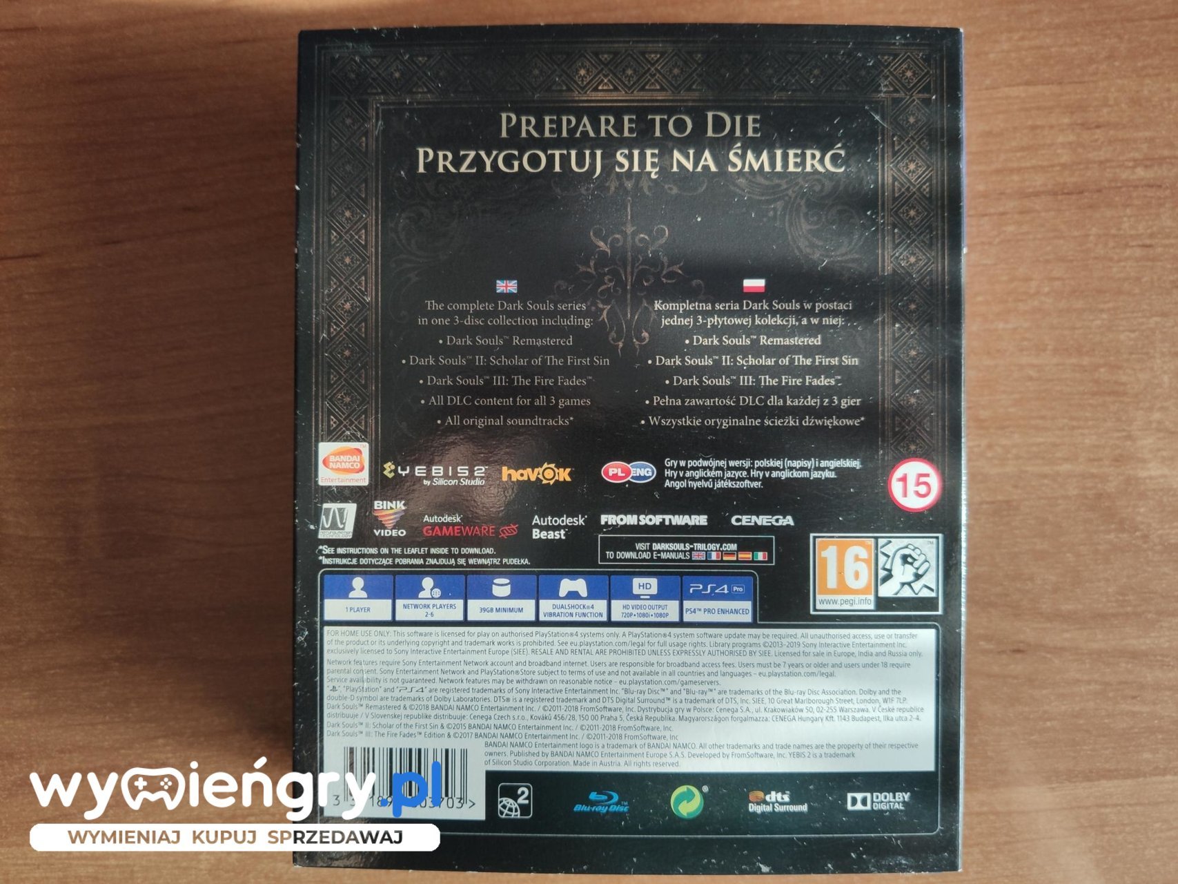 Zanurz się w mrocznym świecie Dark Souls Trilogy i staw czoła swoim najgłębszym lękom. W tej pełnej wyzwań serii gier RPG czeka na Ciebie brutalna walka o przetrwanie, pełna tajemniczych istot i potężnych bossów. Odkrywaj zapomniane królestwa, eksploruj ponure lokacje i poznawaj bogatą mitologię świata Dark Souls. Swoje umiejętności będziesz musiał doskonalić, ponieważ każda decyzja może przesądzić o Twoim losie. Czy odważysz się stawić czoła ciemności i stać się legendarnym wojownikiem? Pudełkowa kolekcja trzech kultowych gier RPG akcji studia From Software, osadzonych w mrocznym uniwersum fantasy i charakteryzujących się niezwykle wysokim poziomem trudności. Dark Souls Trilogy jest pakietem zawierającym trzy rozbudowane gry RPG akcji: Dark Souls: Remastered, Dark Souls II: Scholar of the First Sin oraz Dark Souls III: The Fire Fades. Każda produkcja wchodząca w skład Dark Souls Trilogy została wyposażona we wszystkie dodatki.
