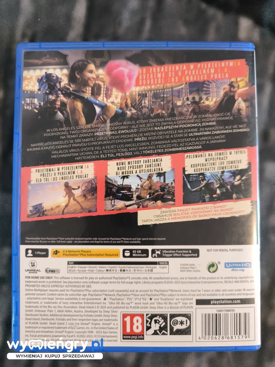Druga część serii gier akcji FPP, w której walczymy o przetrwanie podczas apokalipsy zombie. Dead Island 2 zabiera nas do Los Angeles, gdzie trafiamy jako jeden ze szczęśliwców odpornych na działanie śmiertelnie niebezpiecznego wirusa. Akcja gry Dead Island 2 toczy się po wydarzeniach przedstawionych w pierwszej odsłonie cyklu. Wirus zmieniający ludzi w zombie dotarł do Kalifornii. Wojsko, które miało zapanować nad sytuacją, nie zdołało wykonać zadania, toteż ostatecznie wycofało się z Los Angeles. Metropolia została objęta kwarantanną, a jej mieszkańców pozostawiono na pastwę losu. Okazuje się jednak, że w „mieście aniołów” przebywają osoby, które po ugryzieniu nie zmieniają się w żywe trupy – zamiast tego choroba zapewnia im różnorodne zdolności, o których zdrowi ludzie mogą jedynie pomarzyć.