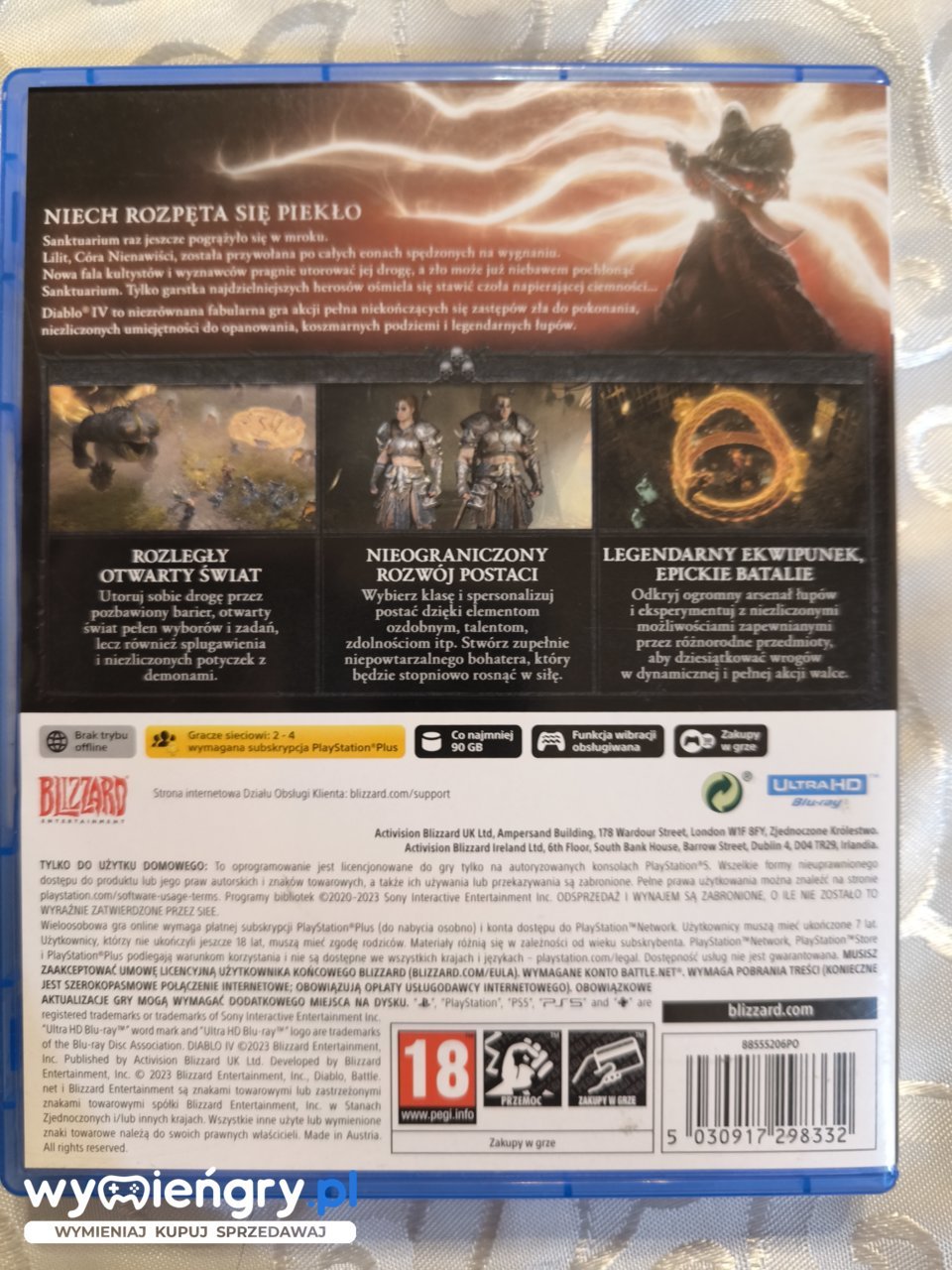 Diablo 4 to RPG typu hack-n-slash od studia Blizzard Entertainment. Diablo IV zabiera nas w mroczną podróż do bezlitosnego świata Sanktuarium. Odkryj wojnę pomiędzy niebiańskimi i piekielnymi siłami oraz staw czoła przerażającym potworom. Wciel się w jednego z bohaterów, zdobądź potężne zdolności i walcz o przetrwanie w otwartym świecie pełnym niebezpieczeństw i niesamowitych tajemnic.
