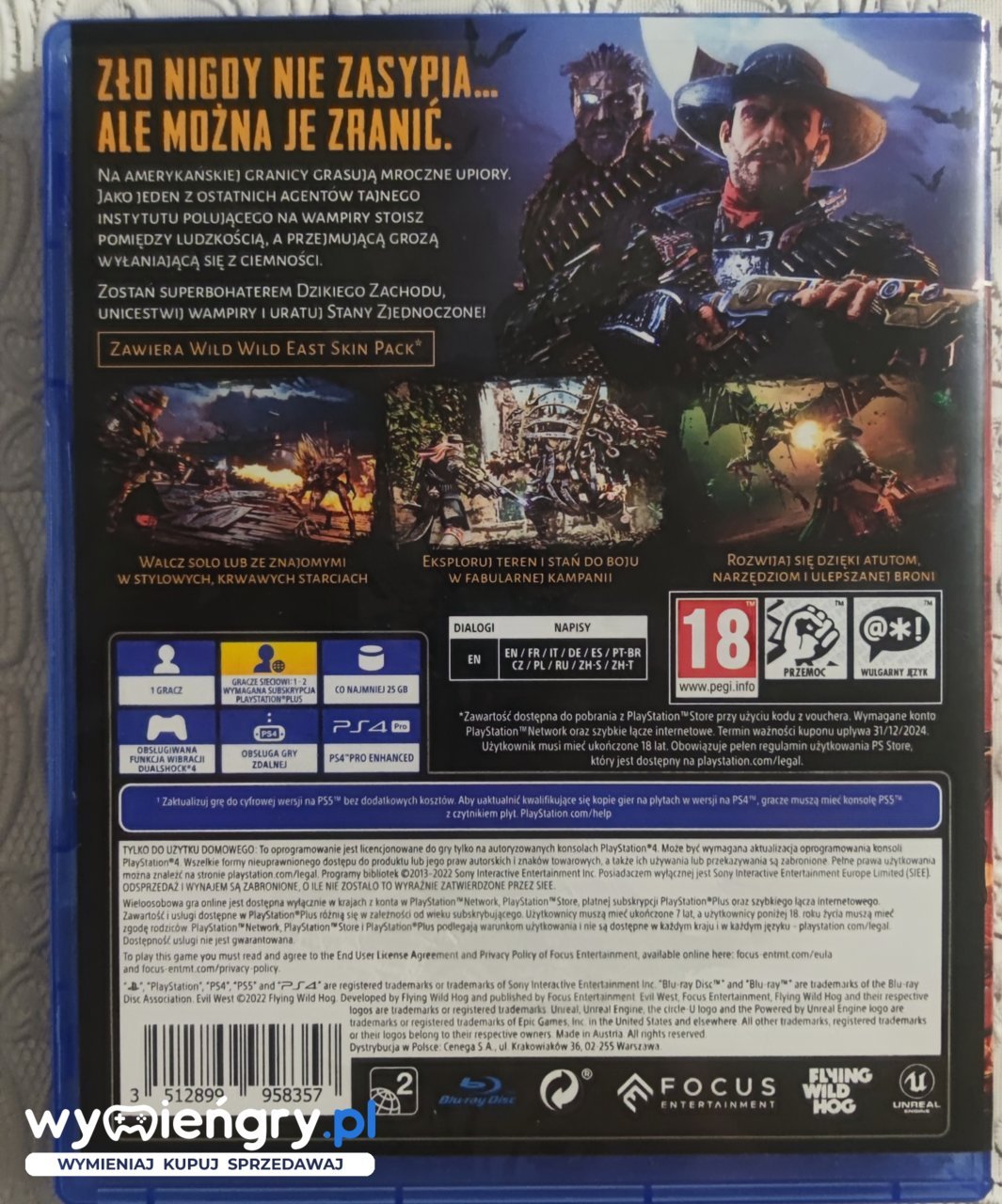 Evil West to gra akcji z elementami RPG opracowana przez polskie studio Flying Wild Hog. Wydaniem zajęło się natomiast Focus Home Interactive. Evil West osadzone zostało w alternatywnej wersji Dzikiego Zachodu, w której klasyczne westernowe motywy mieszają się ze zjawiskami nadprzyrodzonymi i nowoczesną technologią. Całą Amerykę opanowała plaga wampirów. W czasie przygody gracz wciela się w jednego z członków organizacji zajmującej się zwalczeniem potworów. Pudełkowa wersja gry Evil West zawiera dodatek Wild Wild East Pack! Rozpraw się z nieumarłymi w fantastycznym stylu dzięki nowemu strojowi i pięciu skórkom do broni.