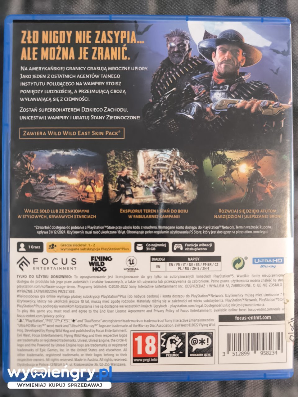 Evil West to gra akcji z elementami RPG opracowana przez polskie studio Flying Wild Hog. Wydaniem zajęło się natomiast Focus Home Interactive. Evil West osadzone zostało w alternatywnej wersji Dzikiego Zachodu, w której klasyczne westernowe motywy mieszają się ze zjawiskami nadprzyrodzonymi i nowoczesną technologią. Całą Amerykę opanowała plaga wampirów. W czasie przygody gracz wciela się w jednego z członków organizacji zajmującej się zwalczeniem potworów. Pudełkowa wersja gry Evil West zawiera dodatek Wild Wild East Pack! Rozpraw się z nieumarłymi w fantastycznym stylu dzięki nowemu strojowi i pięciu skórkom do broni.