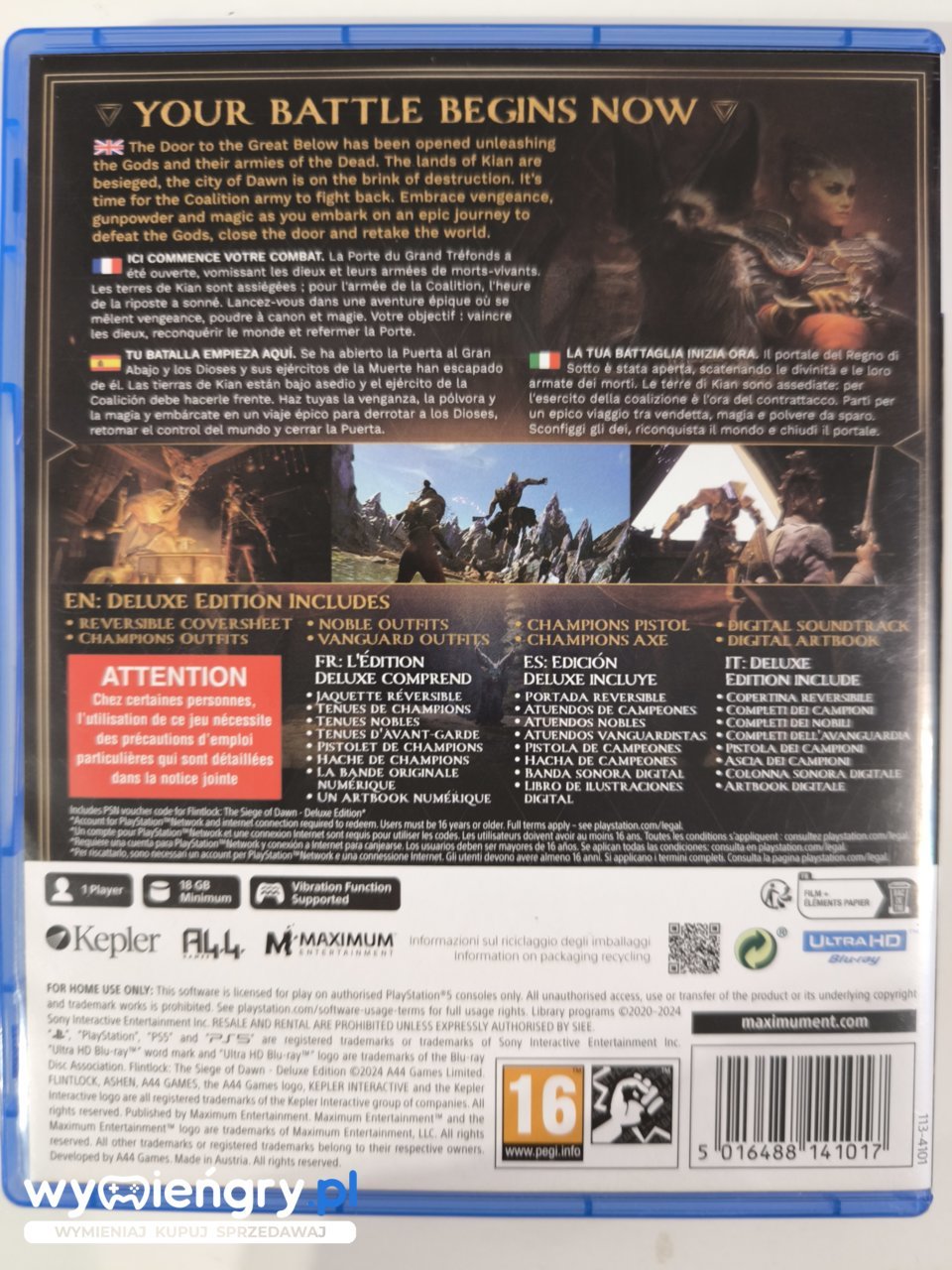 Gra RPG akcji z otwartym światem, opracowana przez studio A44 Games – twórców projektu Ashen. W grze Flintlock: The Siege of Dawn trafiamy do świata skazanego na zagładę przez bóstwa. Główna bohaterka gry – Nor Vanek – stara się pokrzyżować plany bogom. Flintlock: The Siege of Dawn zabiera nas w podróż do fantastycznego uniwersum, gdzie broń palna i magia egzystują obok siebie. Bogowie, którzy przez tysiąclecia byli w uśpieniu, postanowili powrócić, otwierając Drzwi do Zaświatów i pozwalając hordom nieumarłych wybić wszystkich żywych. Armia koalicji, złożona z niedobitków, którym udało się przetrwać inwazję, musi stawić im czoła. W jej szeregach kroczy pałająca żądzą zemsty Nor Vanek, której towarzyszy Enki, czyli podobna do lisa istota władająca magicznymi mocami. Gra ukaże się w Edycji Deluxe, która będzie zawierać: Pełną wersję gry, Dwustronną okładkę, Cyfrową ścieżkę dźwiękową, Cyfrowy artbook, DLC: „Champions, Noble, and Vanguard Outfits”, DLC: „Champions Pistol and Champions Axe Cosmetic pack".