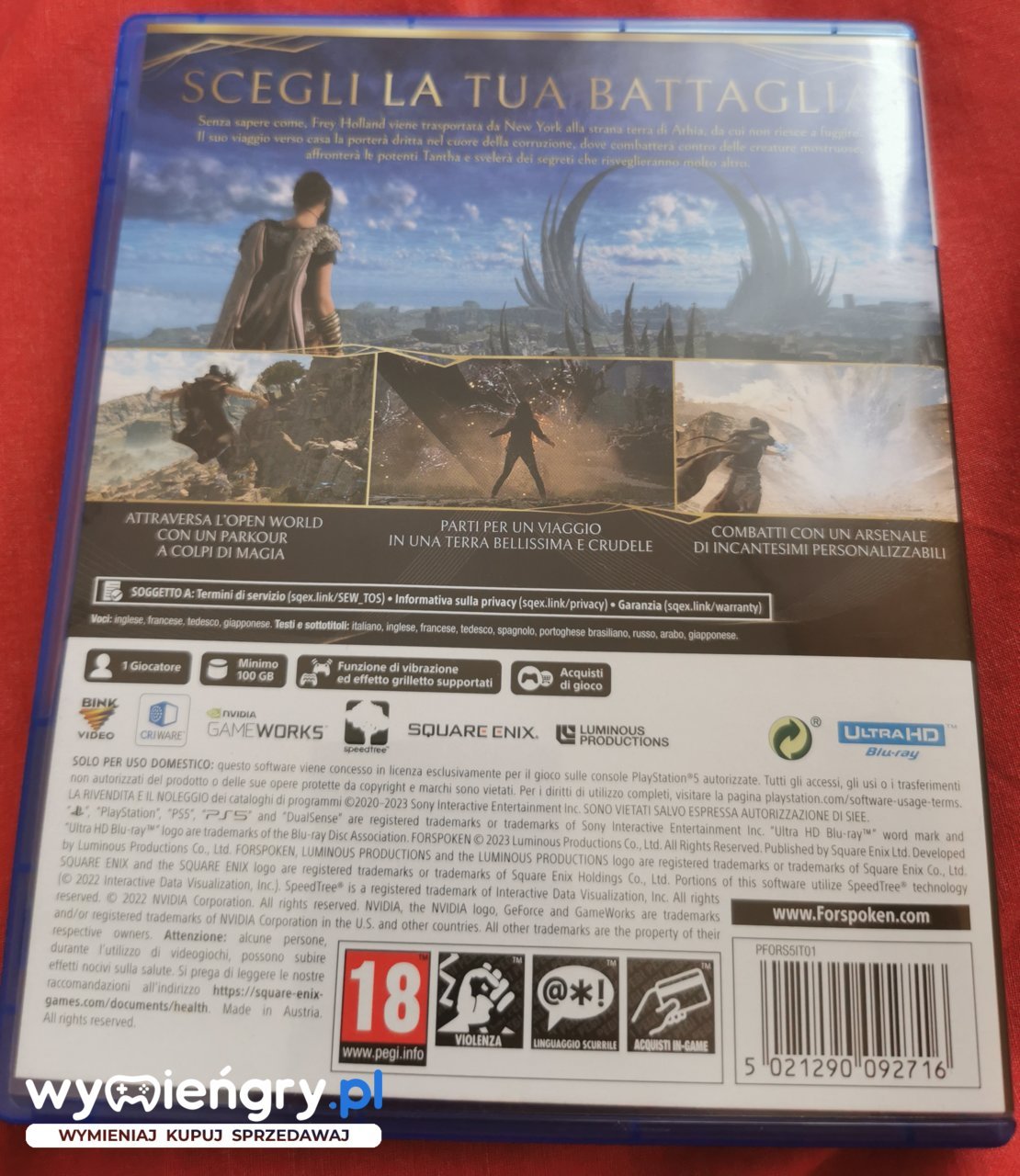 Forspoken, początkowo znane pod roboczym tytułem Project Athia, jest przygodową grą akcji z otwartym światem i elementami RPG. Produkcja została opracowana przez należące do firmy Square Enix studio Luminous Productions, mające w swoim portfolio grę Final Fantasy XV. W Forspoken wcielamy się w młodziutką mieszkankę Nowego Jorku, która za sprawą niewyjaśnionych mocy przeniosła się do pięknej i okrutnej krainy Athia. Wraz z Frey przeżyjemy niesamowitą przygodę w świecie pełnym niebezpieczeństw, magii i tajemnic. Szukając drogi powrotnej, zetrzemy się z licznymi potworami, nauczymy się korzystać z magii i przemierzymy rozległy otwarty świat. Rozległa i zapierająca dech w piersiach kraina Athia, czeka na odkrycie. Pełna niezwykłych krajobrazów i niebywałych stworzeń ożywionych dzięki zachwycającej oprawie graficznej i zaawansowanej technologii, wykorzystującej potencjał konsoli PlayStation 5.