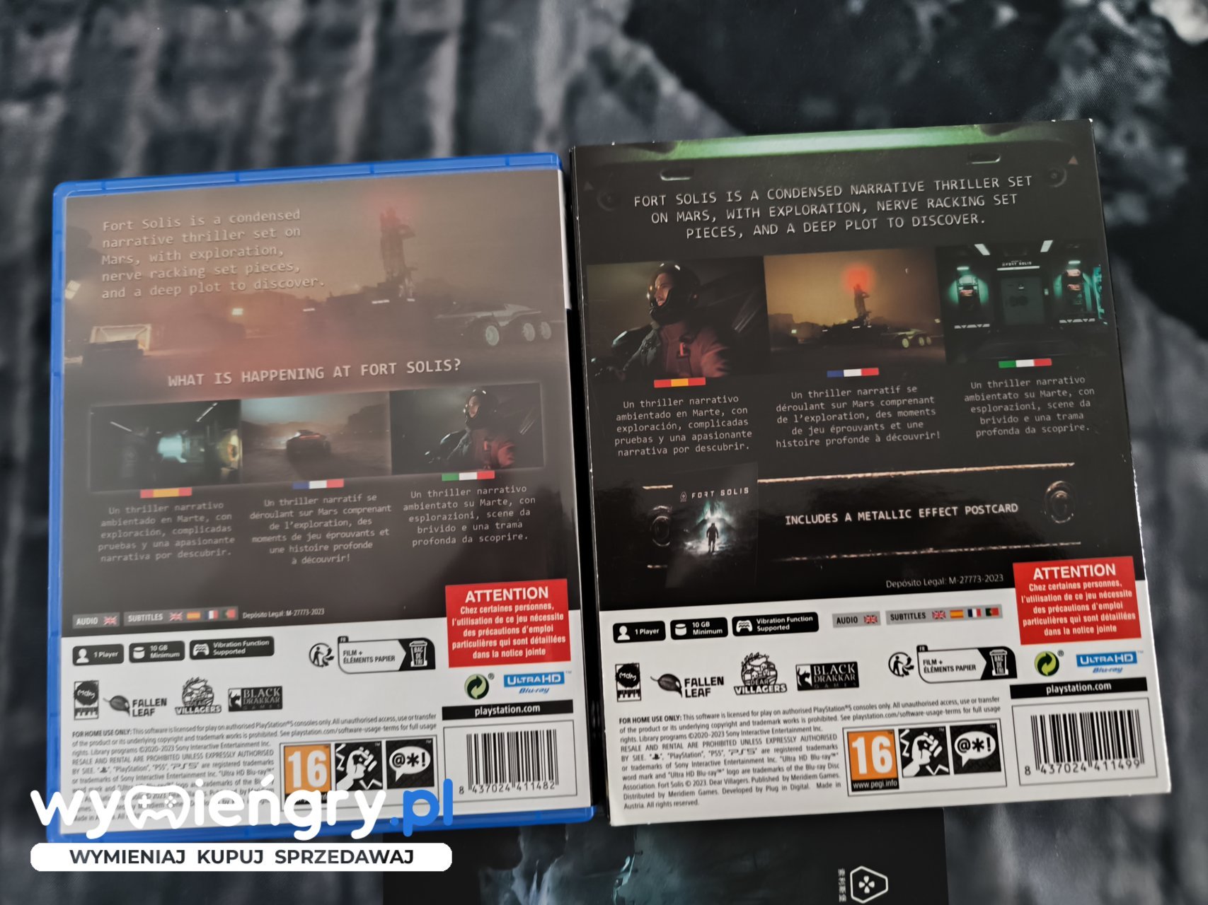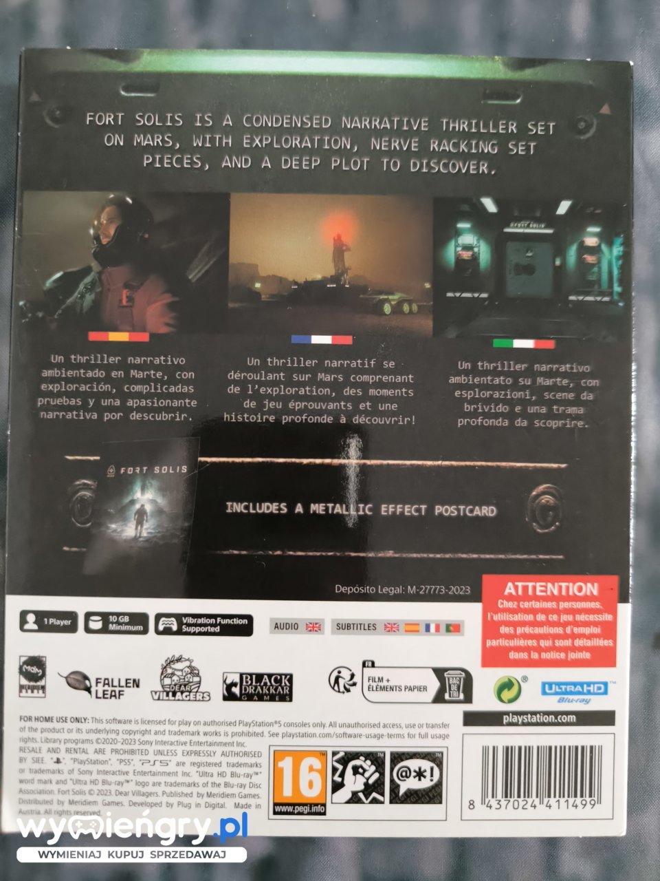 Polski thriller science fiction w formie przygodowej gry akcji TPP. W Fort Solis przemierzamy tytułową placówkę na Marsie, starając się odkryć jej tajemnice. Tytuł ma iście gwiazdorską obsadę; wystąpili w nim między innymi Troy Baker oraz Roger Clark. Akcja gry Fort Solis toczy się w przyszłości, kiedy to ludzkość posiada już stałą placówkę na Marsie. Głównym bohaterem tej produkcji jest inżynier Jack Leary, który w odpowiedzi na rutynowy alarm, przybywa do tytułowego Fort Solis. Choć początkowo miejsce to wygląda na opuszczone, wydarzenia szybko zaczynają wymykać się spod kontroli. Podczas swojego pobytu w Fort Solis, Leary odkrywa prawdę na temat tego miejsca i celu, w jakim zostało stworzone, a także dowiaduje się, jaki los spotkał jego personel. Zawartość wydania:, Gra na konsolę PlayStation 5, Specjalne, trójwymiarowo tłoczone pudełko, Pocztówka z grafiką z gry z metalicznym efektem.
