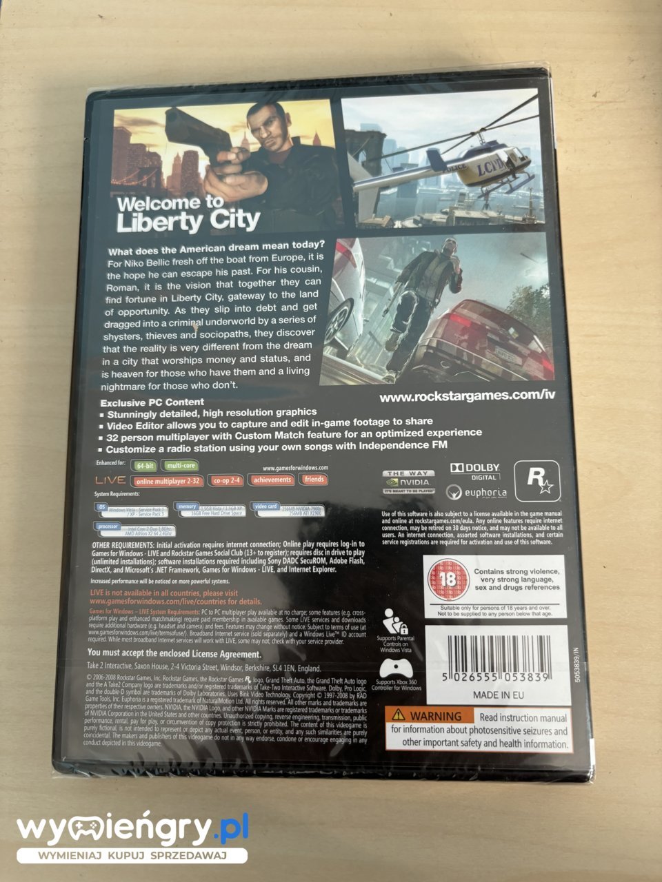 Na sprzedaż legendarna gra komputerowa Grand Theft Auto IV. Absolutny unikat w dzisiejszych czasach w nowej, zafoliowanej, nigdy nie otwieranej wersji pudełkowej. Świetny pomysł na prezent, ale także świetnie się sprawdzi jako element kolekcjonerski. Znajdzie uznanie również wśród pasjonatów tej serii gier od studia Rockstar Games.