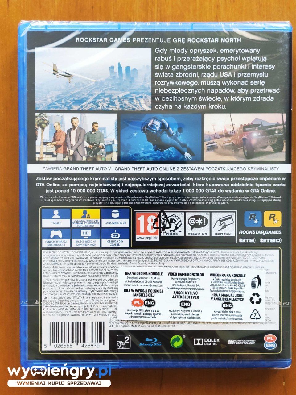 Grand Theft Auto V: Premium Edition na konsole PlayStation 4 zawiera wszystkie elementy fabularne Grand Theft Auto V, bezpłatny dostęp do stale ewoluującego świata Grand Theft Auto Online i wszystkich ulepszeń rozgrywki oraz dodatkowej zawartości, w tym Skoku na koniec świata, Dozbrojenia, Przemytu, Motocyklistów i nie tylko. Otrzymasz także Zestaw początkującego kryminalisty, który jest najszybszym sposobem, aby rozkręcić swoje przestępcze imperium w Grand Theft Auto Online. W GTA V: Premium Edition młody opryszek, emerytowany rabuś i przerażający psychol wpadają w tarapaty i muszą wykonać serię niebezpiecznych napadów, aby przetrwać w bezlitosnym mieście, w którym zdrada czyha na każdym kroku.