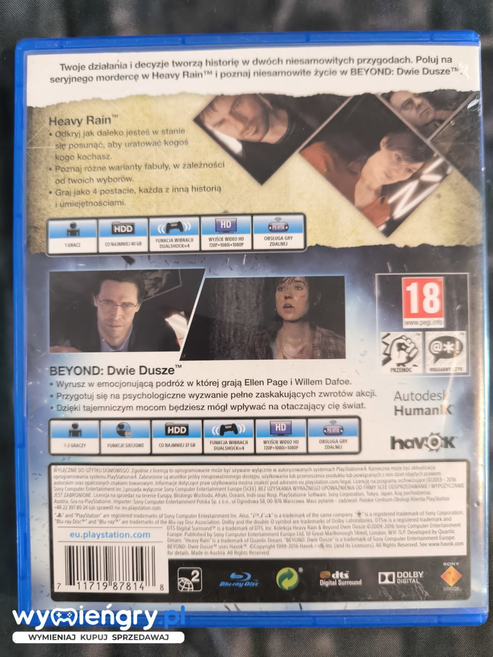 Dwie historie pełne emocji. Przygotuj się, by wziąć udział w jednej z najbardziej wciągających przygód, jakie kiedykolwiek pojawiły się na systemy rozrywki. Zdobywszy popularność na PlayStation 3, gry Heavy Rain oraz BEYOND: Dwie Dusze prezentują się i funkcjonują jeszcze lepiej na PlayStation 4. Twoje decyzje i działania znaczą wszystko. To, jak potoczą się te historie i jak się zakończą zależy wyłącznie od ciebie.