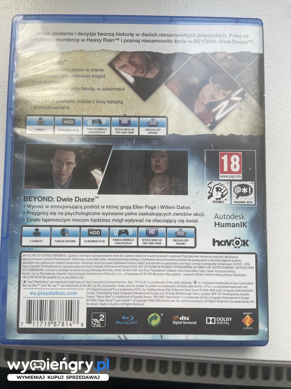 Dwie historie pełne emocji. Przygotuj się, by wziąć udział w jednej z najbardziej wciągających przygód, jakie kiedykolwiek pojawiły się na systemy rozrywki. Zdobywszy popularność na PlayStation 3, gry Heavy Rain oraz BEYOND: Dwie Dusze prezentują się i funkcjonują jeszcze lepiej na PlayStation 4. Twoje decyzje i działania znaczą wszystko. To, jak potoczą się te historie i jak się zakończą zależy wyłącznie od ciebie.