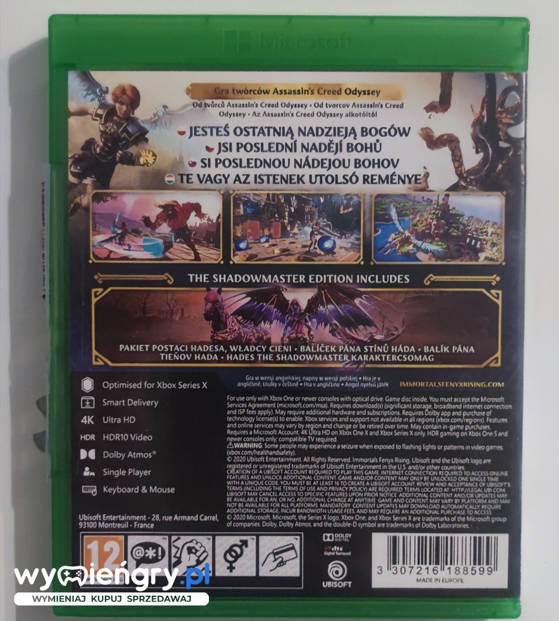 Immortals: Fenyx Rising to baśniowa gra akcji o zapomnianym bohaterze, osadzona w starożytnej Grecji, pełnej mitologicznych stworzeń i znanych greckich bogów. Za grę odpowiadają twórcy Assassin’s Creed Odyssey. Bogowie Olimpu pobłogosławili ci i wręczyli dary: skrzydła Dedala, miecz Achillesa, łuk Odyseusza i nie tylko. Masz też do dyspozycji legendarne moce, które pomogą ci zmienić wyniki twoich starć. Użyj ich, aby walczyć z mitycznymi potworami, rozwiązywać starożytne łamigłówki i odkrywać ogromny otwarty świat. Zawartość Edycji Limitowanej: Kopia gry Immortals Fenyx Rising™. Zawartość cyfrowa: Pakiet błogosławionego uzbrojenia Oriona. Korzystaj z mocy Oriona i gwiazdozbiorów, dzięki temu gwiezdnemu pakietowi uzbrojenia. Zawiera skórki w stylu Oriona dla twojego miecza, topora i łuku. Zawartość pakietu: Miecz: Wedle legend, ma on wystarczająco ostrą klingę, aby ściąć gwiazdę z nieba. Same gwiazdozbiory boją się bohatera, dzierżącego ten miecz. Topór: Najpiękniejsze spadające gwiazdy zazdroszczą temu słynnemu toporowi jego ostrych krawędzi. Łuk: Korzystaj z mocy spadającej gwiazdy i uwolniaj kosmiczną moc tego łuku. Pryzmatyczne skrzydła. Każdy indywidualny splot piór zawiera w sobie wszystkie możliwe kolory tęczy. Te skrzydła są dumą Dedala.