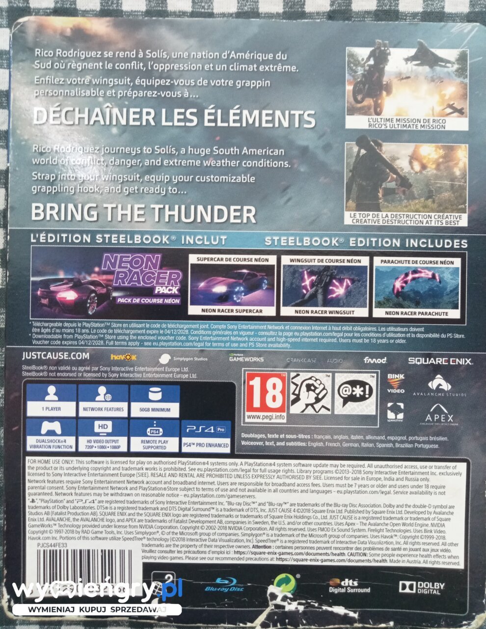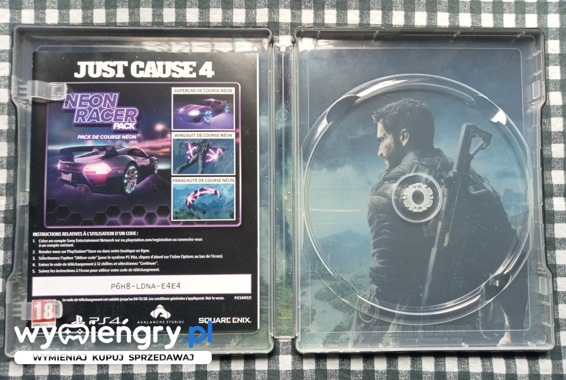 Just Cause 4 jest czwartą odsłoną popularnego cyklu gier akcji z otwartym światem, nad którym pieczę sprawuje szwedzki zespół Avalanche Studios. Głównym bohaterem Just Cause 4 jest znany z wcześniejszych odsłon cyklu Rico Rodriguez. Tym razem protagonista trafia fikcyjnego państwa Solis w Ameryce Południowej, którego mieszkańcy muszą zmagać się nie tylko ze skutkami gwałtownych zjawisk pogodowych, lecz także reżimem wprowadzonym przez Black Hand – paramilitarną organizację dowodzoną przez bezwzględną Gabrielę Morales. Heros musi się z nimi rozprawić, siejąc chaos i zniszczenie wszędzie tam, gdzie się pojawi, a także odkryć prawdę na temat swojego ojca. Just Cause 4: Steelbook Edition zawiera dodatkowo: Kolekcjonerski Steelbook oraz Neon Racer Pack.