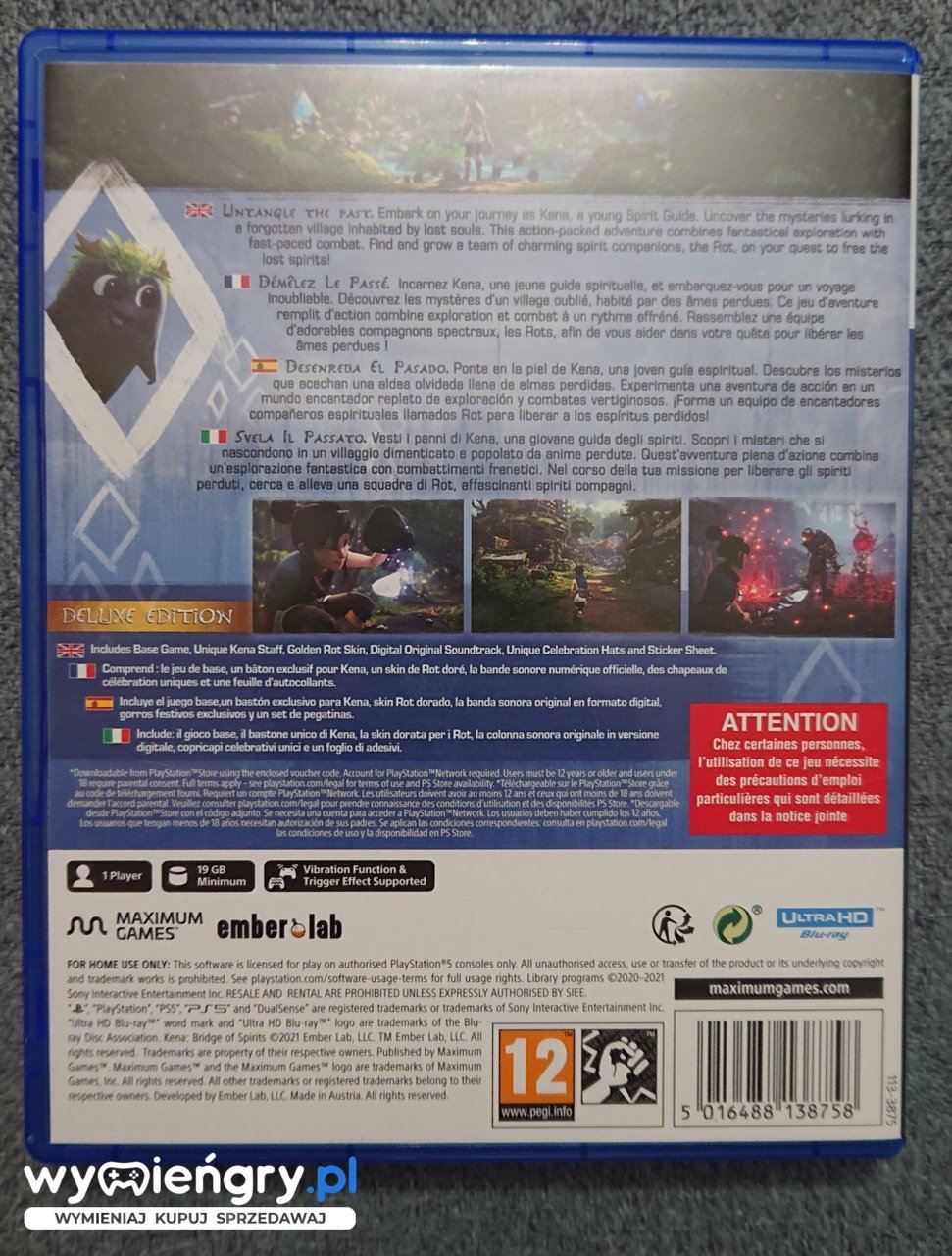 Przygodowa gra akcji, w której przemierzamy barwną, fantastyczną krainę, walcząc z przeciwnikami i rozwiązując zagadki środowiskowe. Główną bohaterką gry Kena: Bridge of Spirits jest młoda przewodniczka duchowa imieniem Kena. Poszukiwania górskiego sanktuarium prowadzą dziewczynę do pięknego, choć ogarniętego zepsuciem lasu, w którego sercu znajduje się opuszczona wioska. Chcąc rozwikłać zagadkę upadku tego miejsca oraz przywrócić mu dawny splendor, Kena musi nawiązać współpracę z czarnymi duszkami znanymi jako Rot. Istoty te powinny bowiem dbać o równowagę w przyrodzie poprzez rozkładanie martwych i gnijących pierwiastków, jednak zostały rozproszone po całej okolicy, co w połączeniu z faktem, że po gęstwinie panoszą się rozwścieczone duchy, uniemożliwia im efektywną pracę. W skład pudełkowego wydania Kena: Bridge of Spirits Deluxe Edition wchodzą: Gra Kena: Bridge of Spirits, Oficjalna cyfrowa ścieżka dźwiękowa, Unikatowa laska Keny, Złota skóra zgnilizny oraz Unikatowe kapelusze dla Rotów.
