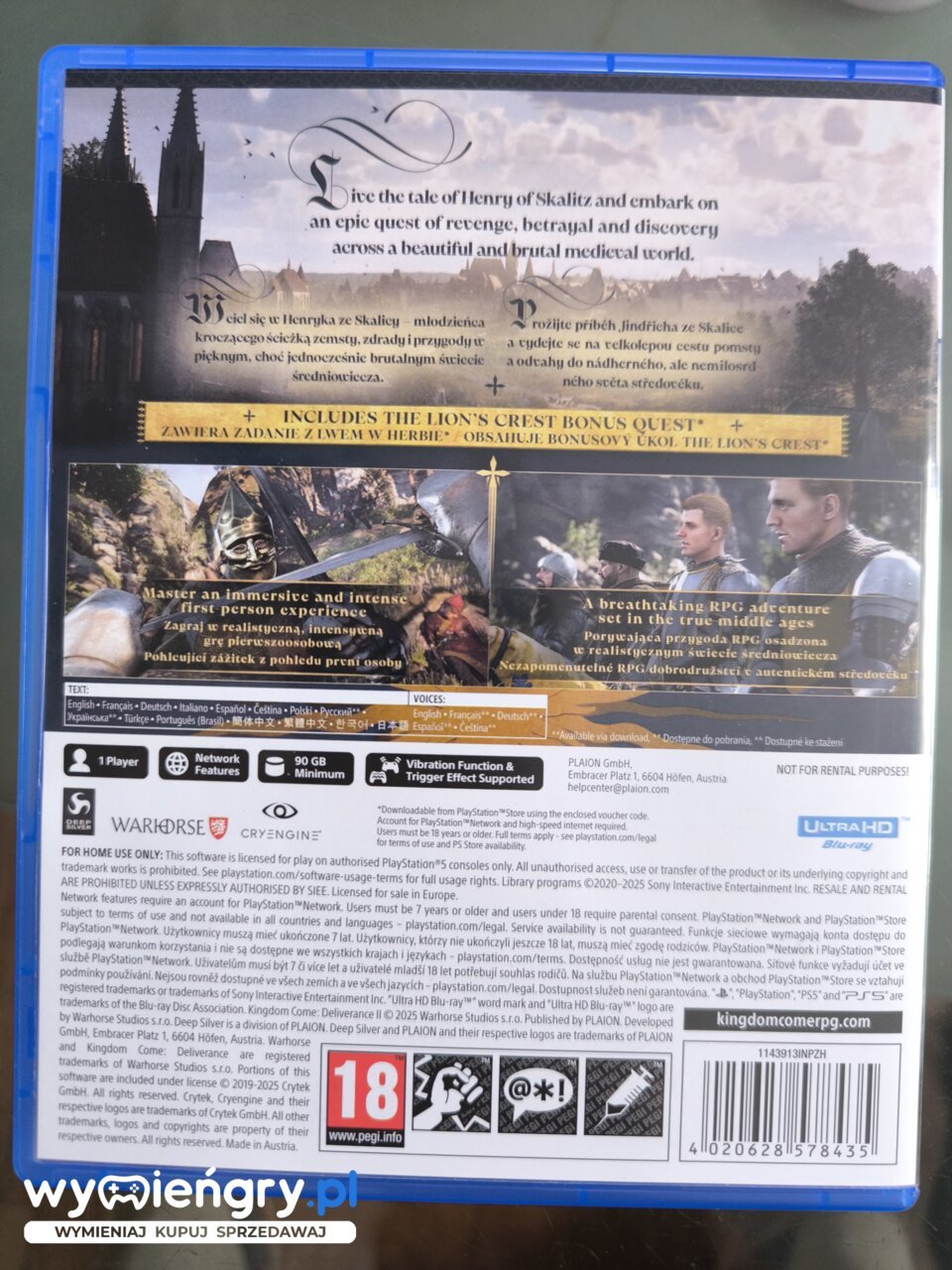 Sequel pierwszoosobowej gry RPG z otwartym światem osadzonej w średniowiecznych Czechach, którą wydano w 2018 roku. Kingdom Come: Deliverance 2 kontynuuje historię Henryka z większym rozmachem, oferując np. dwie rozległe mapy i rozbudowaną mechanikę rozgrywki. Wcielasz się w Henryka ze Skalicy – zwykłego człowieka dokonującego niezwykłych czynów – uwikłanego w porywającą opowieść o zemście, zdradzie i niesamowitych odkryciach. Wyrusz w epicką podróż „ze skromnej kuźni do królewskiego dworu”, poszukując sensu w tym pięknym, aczkolwiek brutalnym średniowiecznym świecie. Od tętniących życiem miejskich ulic po gęste lasy – odkrywaj średniowieczną Europę w tym otwartym świecie pełnym niezapomnianych przygód, akcji, emocji oraz cudów.