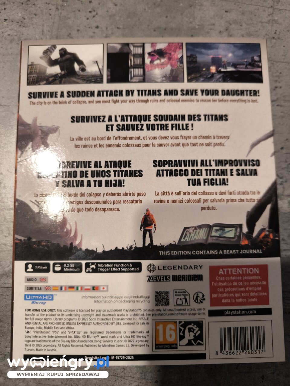 Polska przygodowa gra akcji w konwencji platformówki 2,5D, osadzona w świecie MonsterVerse wytwórni Legendary. Kong: Survivor Instinct przenosi nas do zniszczonego miasta opanowanego przez Tytanów po wydarzeniach z filmu Godzilla vs. Kong. Akcja gry ma miejsce krótko po wydarzeniach z filmu Godzilla vs. Kong studia Legendary z 2021 roku. Bitwa pomiędzy Godzillą a King Kongiem zniszczyła Hongkong, zostawiając labirynt zgliszcz. W Kong: Survivor Instinct wcielamy się w Davida, pracownika platformy wiertniczej, który musi się przedrzeć przez miasto i odnaleźć swoją zaginioną córkę Stacy. Przemierzając zniszczone ulice, spotykamy innych ocalałych mieszkańców. Część z nich chce nam pomóc w przeprawie, inni walczą z nami o zasoby. Fizyczna edycja Titans Edition zawiera dodatkowo książkę przybliżającą potwory, które spotkacie w grze.