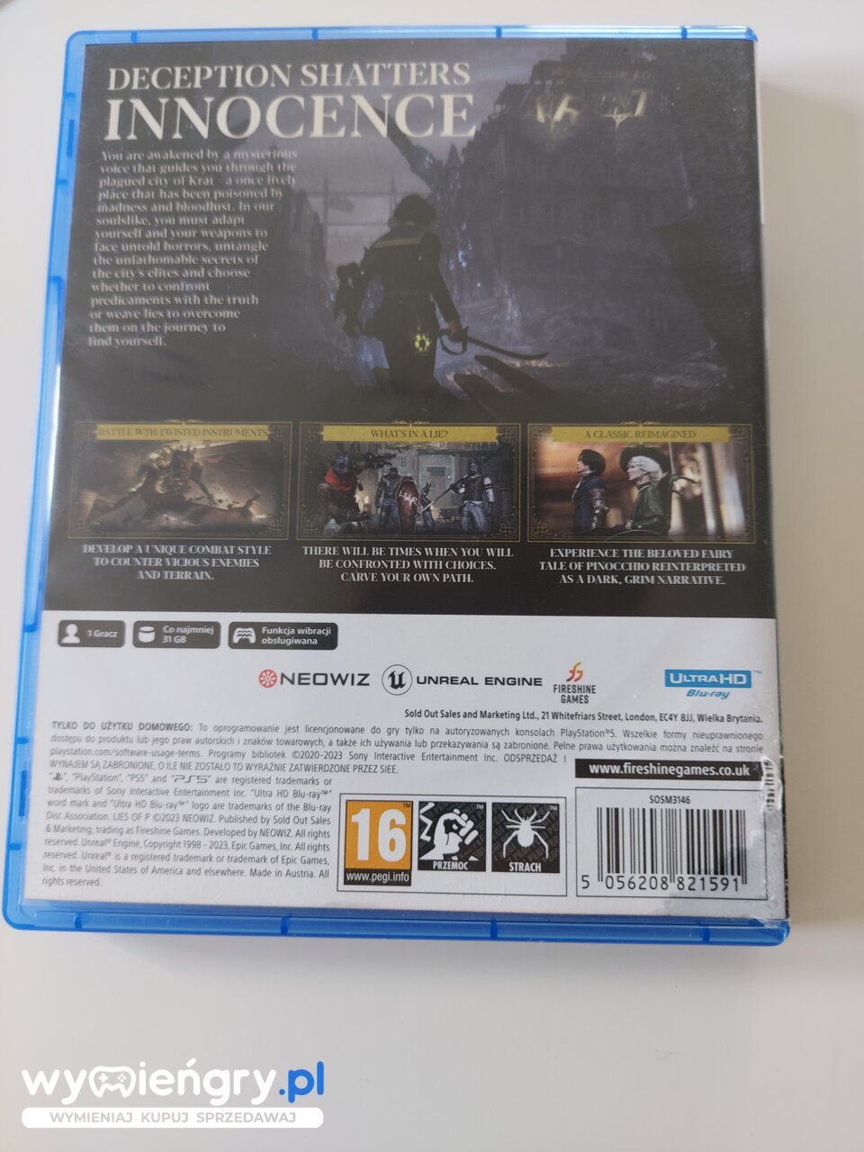 Mroczna adaptacja powieści Pinokio, zrealizowana w formie produkcji typu soulslike. W Lies of P wcielamy się w będącego mechaniczną lalką bohatera, który szukając pana Geppetta, przemierza posępne miasto Krat i stawia czoła czyhającym tam na niego koszmarom. Lies of P zabiera nas w podróż do ponurego Krat. Ta niegdyś piękna metropolia przywodząca na myśl zachodnioeuropejskie miasta z okresu Belle Époque (na czele z Paryżem), teraz świeci pustkami, a pośród jej zrujnowanych zabudowań można spotkać różnego rodzaju monstra. Głównym bohaterem gry jest ożywiona, mechaniczna lalka imieniem Pinokio (ang. Pinocchio). Protagonista budzi się na opuszczonym dworcu kolejowym, a jedyną wskazówkę na temat tego, co powinien zrobić, stanowi leżąca przed nim kartka. Napisano na niej, że w mieście przebywa pan Geppetto, którego Pinokio powinien poszukać. Nie mając innego wyjścia, bohater postanawia wyruszyć przed siebie i stawić czoła zagrożeniom czyhającym na niego w Krat, mając nadzieję, że w końcu znajdzie odpowiedzi na dręczące go pytania.