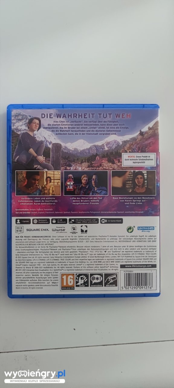 Life is Strange: True Colors to trzecia główna odsłona popularnego cyklu epizodycznych gier przygodowych, zapoczątkowanego w 2015 roku. Produkcja została opracowana przez studio Deck Nine – autorów ciepło przyjętego prequela pierwszej części serii, zatytułowanego Life is Strange: Before the Storm. W odróżnieniu od poprzednich odsłon serii, LiS True Colors nie zostało podzielone na epizody. Czeka nowa główna grywalna postać i emocjonująca tajemnica do odkrycia! Alex Chen przez długi czas uciszała swoje „przekleństwo” – nadprzyrodzoną moc przeżywania, absorpcji i manipulowania silnymi emocjami innych. Emocje te Alex postrzega jako promieniejące, kolorowe aury. Kiedy jej brat ginie w rzekomym wypadku, Alex musi użyć swojej niestabilnej mocy, aby odkryć prawdę i ujawnić mroczne sekrety małego miasteczka.