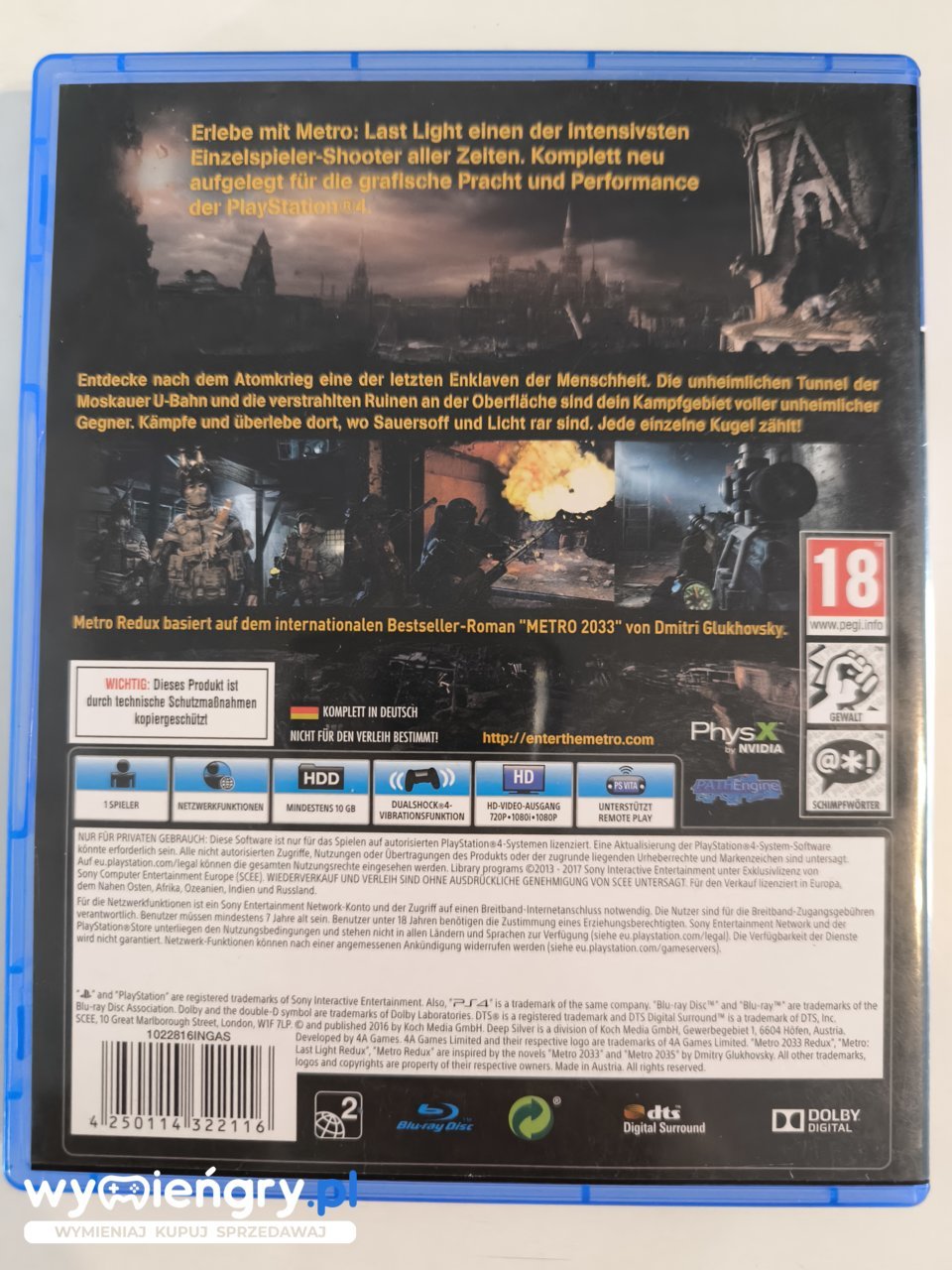 Odświeżona edycja drugiej odsłony strzelaniny FPP z elementami survival horroru, Metro: Last Light, przygotowana głównie z myślą o konsolach ósmej generacji. Akcja serii Metro rozgrywa się w świecie po katastrofie nuklearnej, która zmiotła ludzkość z powierzchni Ziemi. Ocaleli tylko Ci, którzy zdążyli się skryć w podziemnych schronach, a także w tunelach moskiewskiego metra. Głównym bohaterem cyklu jest młody Artem, żyjący w jednej z niewielkich osad. Choć mieszkańcom nie brakuje wody i żywności, muszą mierzyć się z atakami zmutowanych potworów. W ostatnim czasie ataki tych bestii przybrały na sile, znacznie przetrzebiając szeregi obrońców. Gdy przyjaciel ojca Artema nie wraca z kolejnej wyprawy, młodzieniec wyrusza ostrzec innych mieszkańców metra oraz znaleźć sposób na ocalenie swojego domu. Historię jego wyprawy poznajemy w Metro 2033.