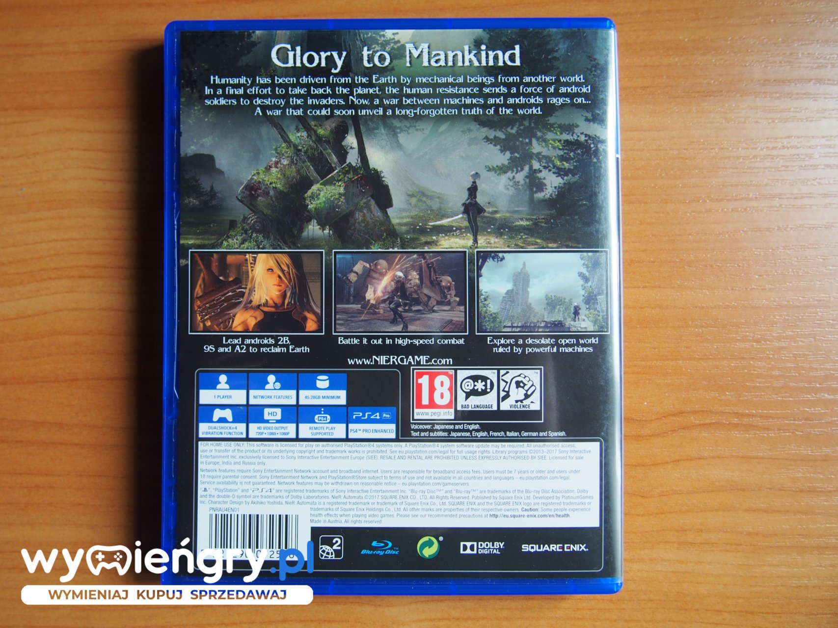 Nier: Automata to wydane na platformę PlayStation 4 RPG akcji będące kontynuacją Nier z 2010 roku. Fabuła Akcja Nier: Automata toczy się w odległej przyszłości. Inwazja obcej cywilizacji zmiotła ludzkość z powierzchni Ziemi, a niedobitki schroniły się w bazach księżycowych. Kampania opowiada historię kobiecego androida imieniem YoRHa No.2 Type B, skonstruowanego przez mieszkańców Księżyca. Wojowniczka zostaje wysłana na naszą planetę z zadaniem odbicia jej z wrogich rąk.