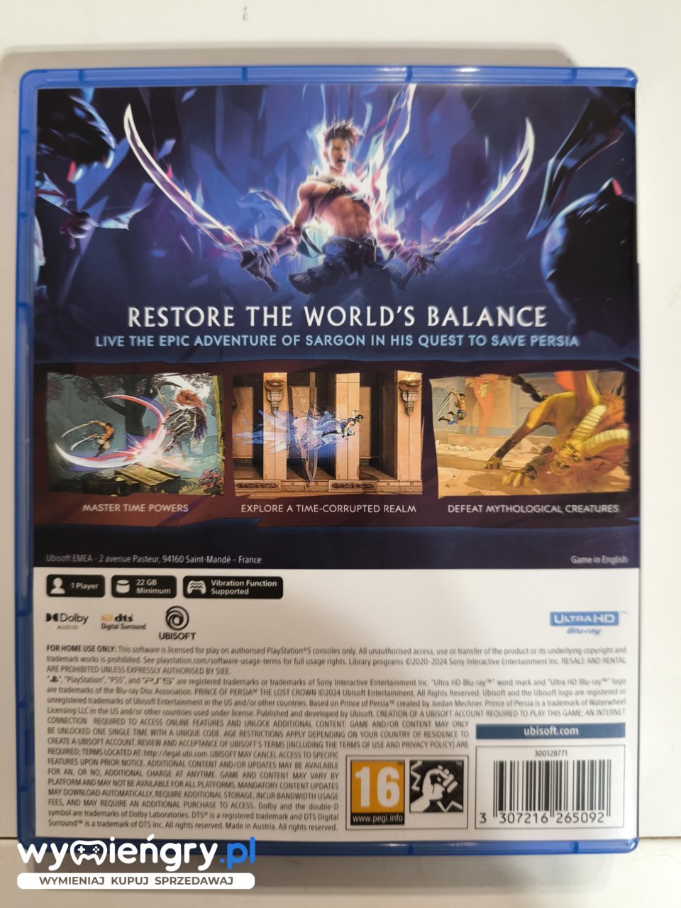 Prince of Persia: The Lost Crown to przygodowa gra akcji zrealizowana w formie platformówki 2.5D. Podczas zabawy gracz eksploruje mapy, rozwiązane zagadki, unika zagrożeń i walczy z wrogami. Kluczową rolę w rozgrywce odgrywają akrobatyczne ewolucje i specjalne moce bohatera. Pod względem fabularnym gra jest rebootem, który nie stanowi kontynuacji wątków z żadnego wcześniejszego wcielenia serii. Akcja toczy się w starożytnej Persji. Gracz wciela się w Sargona, jednego z tzw. Nieśmiertelnych, czyli elitarnych wojowników królewskiej gwardii. Historia zaczyna się, gdy ochraniany przez nas książę Persji zostaje porwany i na nasze barki spada jego uratowanie. Nie będzie to łatwe, bo ślad księcia wiedzie na Górę Qaf, gdzie dochodzi do niewyjaśnialnych zjawisk – na czele z zaburzeniami czasu.