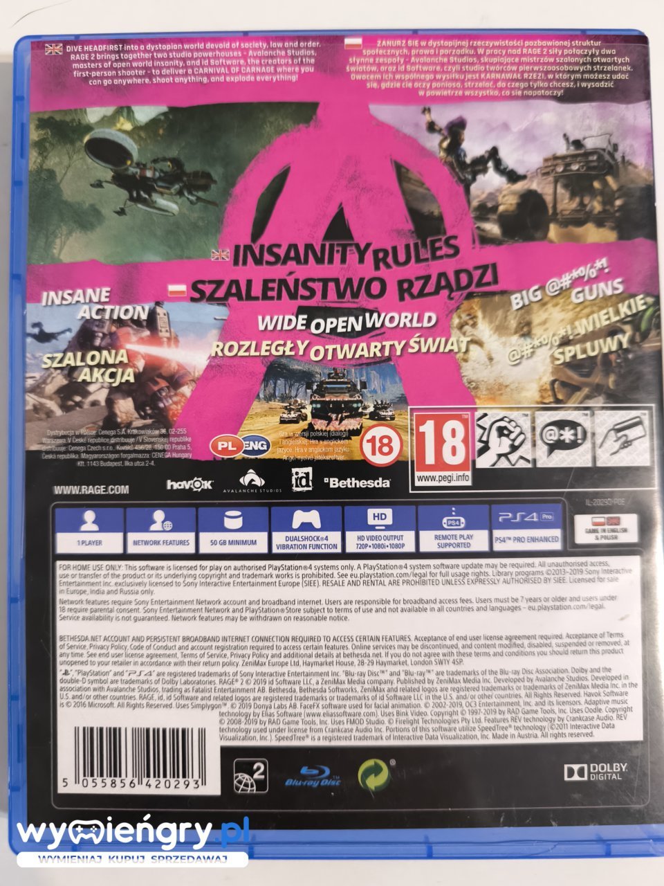 Druga część serii postapokaliptycznych gier FPS, zapoczątkowanej przez zespół id Software. W pracy nad RAGE 2 siły połączyły dwa słynne zespoły – Avalanche Studios, skupiające mistrzów szalonych otwartych światów, oraz id Software, czyli studio bogów pierwszoosobowych strzelanin – a owocem ich wspólnego wysiłku jest karnawał rzezi, w którym możesz udać się, dokąd tylko chcesz, strzelać, do czego tylko chcesz, i wysadzić w powietrze wszystko, co się napatoczy. Pozbawiono cię domu i pozostawiono na pewną śmierć w świecie, gdzie czekają na ciebie niesamowite starcia pojazdów, pierwszoosobowa rozwałka na sterydach, przepełniony szaleństwem otwarty świat oraz zapalczywa walka o wolność i sprawiedliwość. Musisz przedrzeć się przez bezwzględne pustkowia, walcząc z żądnymi krwi gangami, by zdobyć narzędzia i technologię, które umożliwią zadanie ostatecznego ciosu opresyjnej Władzy.