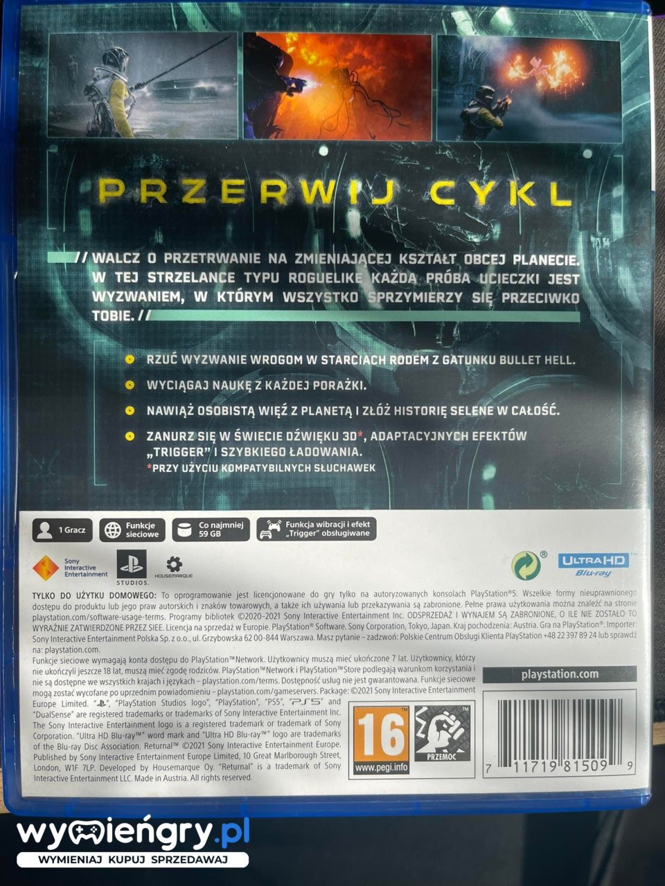 Returnal to gra akcji od studia Housemarque, w której wcielamy się w postać astronautki przeżywającej po wielokroć rozbicie swojego statku na nieznanej planecie. Gracz ma za zadanie odkryć tajemnice tego świata i wyrwać się z pętli czasu. W grze wcielamy się w postać astronautki Selene, która jest zmuszona w kółko przeżywać to samo wydarzenie – rozbicie swojego statku na dziwnej planecie. Śmierć sprawia tylko, że kobieta powraca do punktu wyjścia. Dodatkowo po każdym odrodzeniu świat, na którym „ląduje” zmienia się, a ona wraz z nim. Jedynym wyjściem, aby bohaterka wyrwała się z tej przedziwnej pętli, jest odkrycie tajemnic, które skrywa ta niebezpieczna kraina. Wraz z każdą śmiercią Selene pogrąża się jednak coraz bardziej w szaleństwie.