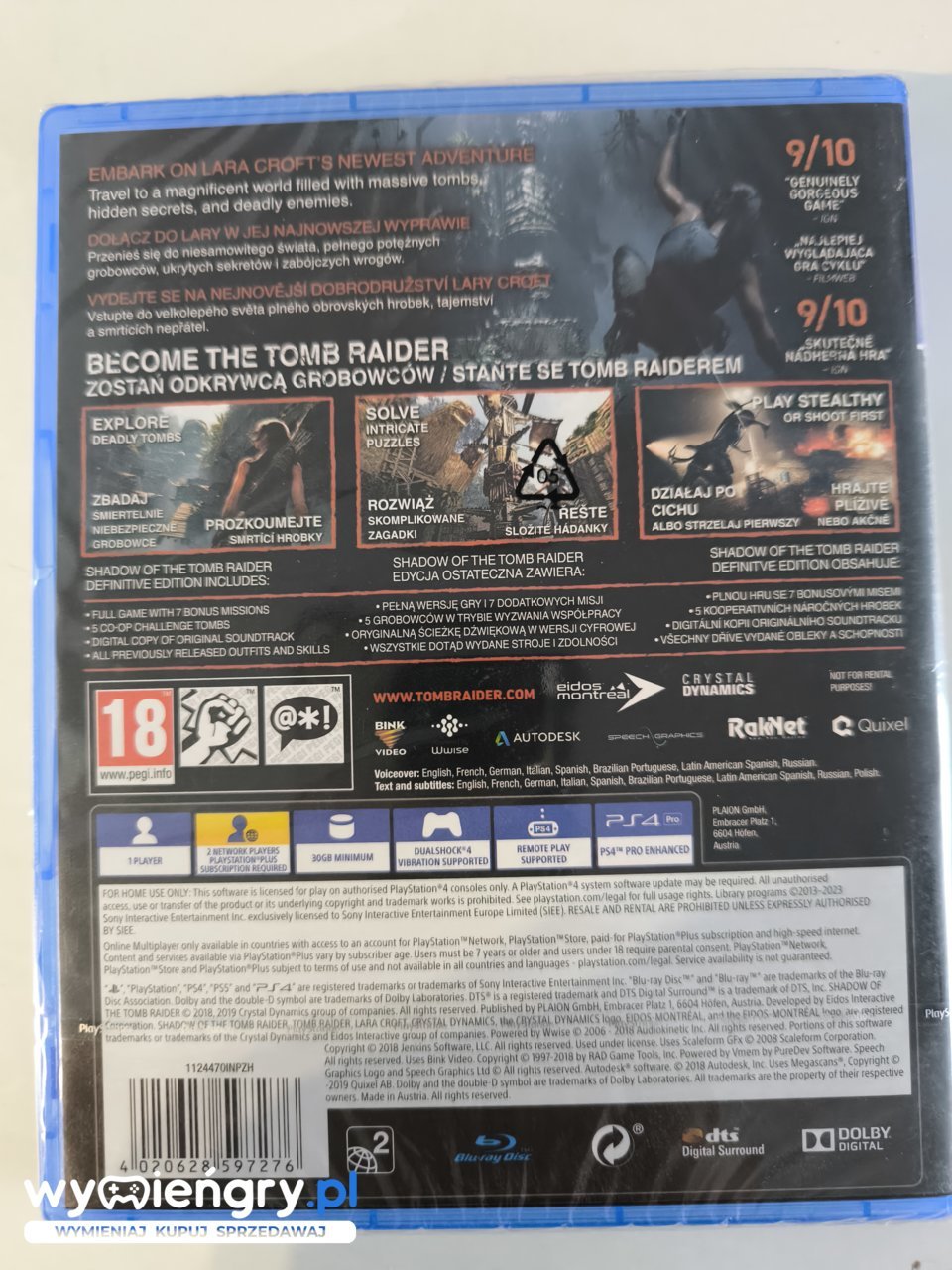 Shadow of the Tomb Raider: Definitive Edition na PS4 to kolejna część jednej z najsłynniejszych serii przygodowych gier akcji. Jednocześnie jest to trzecia odsłona przygód młodej Lary Croft, zapoczątkowanych w 2013 roku. Akcja Shadow of the Tomb Raider toczy się po wydarzeniach przedstawionych w Rise of the Tomb Raider. Shadow of the Tomb Raider: Edycja Ostateczna zawiera wszystkie wydane do tej pory rozszerzenia oraz dodatki. Rozegraj ostatni rozdział historii, która ukształtowała postać Lary Croft. Przepustka sezonowa, zawarta w wydaniu Edycji Ostatecznej, zapewnia dostęp do wielu dodatkowych grobowców, misji, modeli broni czy strojów bohaterki; bonusów Edycji Croftów, oraz całkowicie nowy strój „Croft Fitness” zawarty w Edycji Ostatecznej. Edycja zawiera również kilka usprawnień rozgrywki.