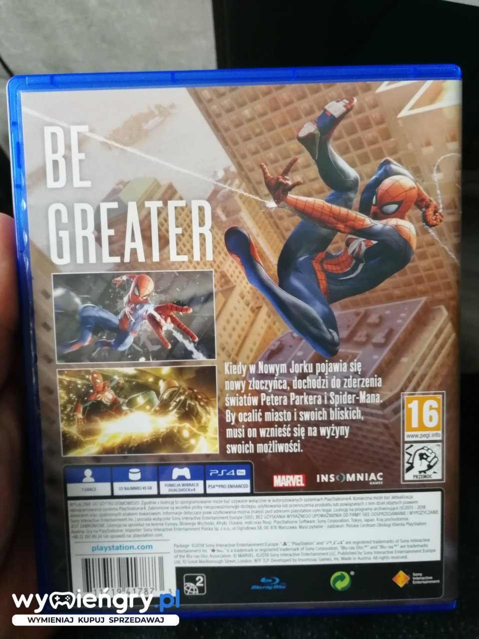 Przygodowa gra akcji z otwartym światem opracowana przez studio Insomniac Games. Gracz wciela się w tytułowego Człowieka-Pająka stawiającego czoła przedstawicielom przestępczego światka trzęsącego Nowym Jorkiem. Historia opowiadana w grze Spider-Man nie jest bezpośrednią adaptacją komiksowych przygód czy tych znanych z filmów. Studio Insomniac Games zatroszczyło się o zupełnie nową fabułę, ale występują w niej klasyczne elementy (podwójne życie Petera Parkera) oraz znane postacie. Marvel's Spider-Man pozwoli wcielić się w jednego z najsłynniejszych superbohaterów i używać akrobatycznych zdolności, improwizować oraz miotać pajęczynami, z których słynie pełzający po ścianach heros. Pojawią się też elementy, które nie występowały w dotychczasowych grach o Spider-Manie. System ruchu wykorzystujący parkour i elementy środowiska, nowy system walki i scenerie godne najlepszych Hollywoodzkich produkcji – w taką grę o Spider-Manie jeszcze nie graliście.