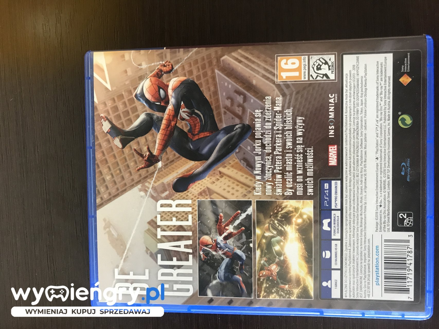 Przygodowa gra akcji z otwartym światem opracowana przez studio Insomniac Games. Gracz wciela się w tytułowego Człowieka-Pająka stawiającego czoła przedstawicielom przestępczego światka trzęsącego Nowym Jorkiem. Historia opowiadana w grze Spider-Man nie jest bezpośrednią adaptacją komiksowych przygód czy tych znanych z filmów. Studio Insomniac Games zatroszczyło się o zupełnie nową fabułę, ale występują w niej klasyczne elementy (podwójne życie Petera Parkera) oraz znane postacie. Marvel's Spider-Man pozwoli wcielić się w jednego z najsłynniejszych superbohaterów i używać akrobatycznych zdolności, improwizować oraz miotać pajęczynami, z których słynie pełzający po ścianach heros. Pojawią się też elementy, które nie występowały w dotychczasowych grach o Spider-Manie. System ruchu wykorzystujący parkour i elementy środowiska, nowy system walki i scenerie godne najlepszych Hollywoodzkich produkcji – w taką grę o Spider-Manie jeszcze nie graliście.
