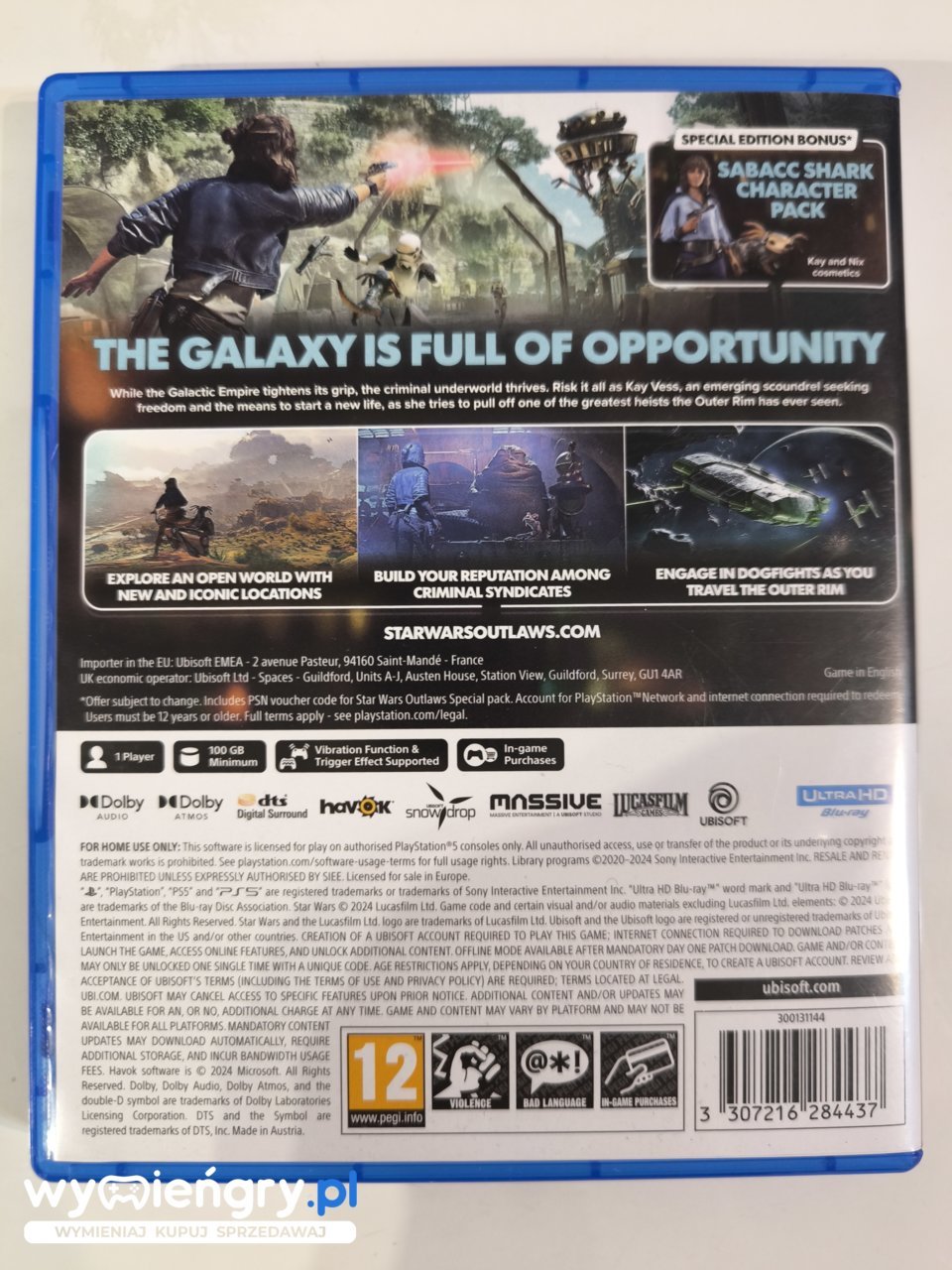 Przygodowa gra akcji TPP z otwartym światem, oparta na licencji Gwiezdnych wojen. W Star Wars: Outlaws wcielamy się w Key Vess, szmuglerkę, która działa w podziemiu, lawirując pomiędzy różnymi stronami. Tytuł pozwala przemierzać szereg planet i przestrzeń kosmiczną. Poznaj pierwszą grę z uniwersum Star Wars z otwartym światem i odwiedzaj wyjątkowe miejsca w całej galaktyce – dobrze znane i nowe. Kuś los jako łotrzyca Kay Vess w pogoni za wolnością i zasobami na rozpoczęcie nowego życia. Walcz, kradnij i wywijaj się syndykatom przestępczym, by dołączyć do najbardziej poszukiwanych w galaktyce.