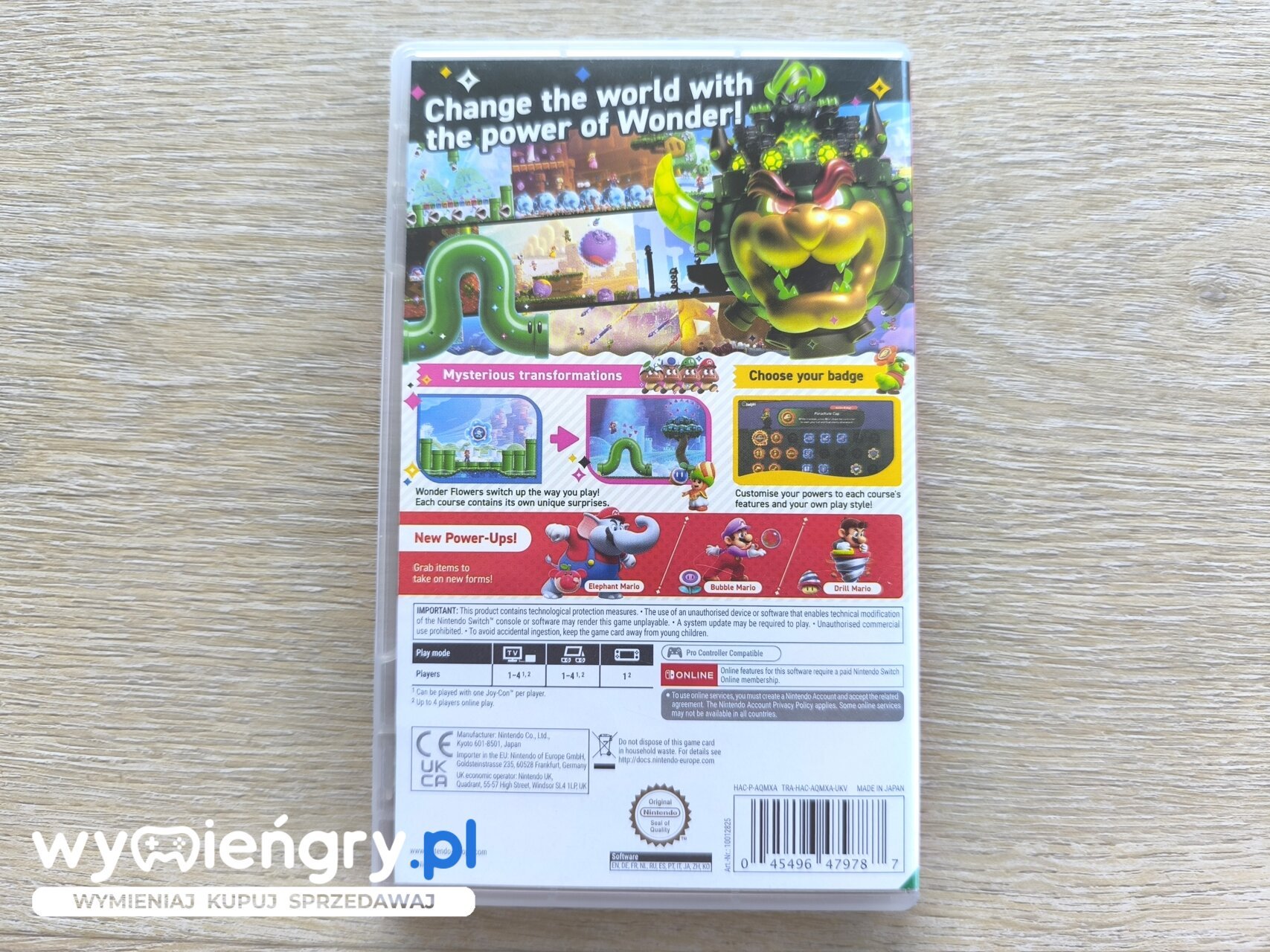 Platformówka 2,5D z widokiem z boku. Na tle innych części serii Super Mario Bros. Wonder wyróżnia się za sprawą obecności tak zwanych Cudownych Kwiatów, czyli power-upów wpływających na rozgrywkę na rozmaite, nieprzewidywalne sposoby. Wkrocz do świata cudów w Super Mario Bros. Wonder na Nintendo Switch! Klasyczna gra Mario z przewijaniem bocznym została odwrócona do góry nogami dzięki dodatkowi Wonder Flowers! Te zmieniające grę przedmioty wyzwalają spektakularne momenty, które trzeba zobaczyć, aby uwierzyć. Zobacz, jak rury ożywają, siej spustoszenie jako gigantyczna kolczasta kula i zobacz jeszcze więcej nieoczekiwanych wydarzeń zwanych Cudownymi Efektami.