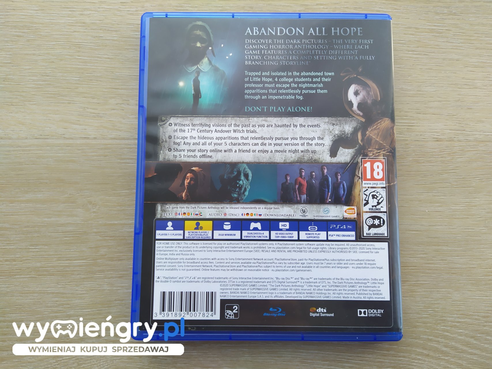 Utrzymana w klimatach horroru gra przygodowa, będąca drugą odsłoną antologii The Dark Pictures. Little Hope opowiada historię kilku postaci próbujących przetrwać konfrontację z siłami zła, a zabawa polega głównie na eksploracji oraz podejmowaniu decyzji. W The Dark Pictures: Little Hope śledzimy losy czwórki nastolatków, którzy w towarzystwie swojego profesora trafiają do tytułowego miasteczka. Miejsce to spowija złowieszcza mgła i choć wydaje się ono opuszczone, szybko wychodzi na jaw, że opanowały je mroczne siły. Protagoniści znajdują się w potrzasku, a szukając sposobu na ucieczkę, muszą stawić czoła przerażającym wizjom z XVII-wiecznego polowania na czarownice oraz zmierzyć się z koszmarami czyhającymi na nich w ciemnościach.