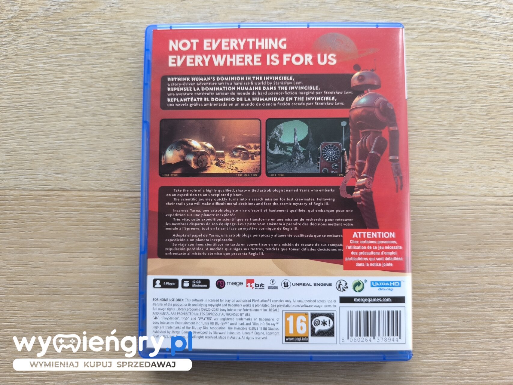 The Invincible (Niezwyciężony) to retrofuturystyczny thriller science fiction na motywach powieści Stanisława Lema o tym samym tytule, zrealizowany jako przygodówka FPP. Gracz trafia na pustynną planetę Regis III, gdzie musi zbadać sprawę zaginionej załogi. Gracz wciela się w Yasnę - członkinię grupy prowadzącej międzygwiezdną misję badawczą. Wraz z rozpoczęciem przygody budzi się ona na obcej planecie Regis III. Nie pamięta, jak się tutaj znalazła, ale wie, że nie przybyła w to miejsce sama. Pozostali członkowie załogi zniknęli jednak bez śladu i bohaterka będzie musiała ich odnaleźć.