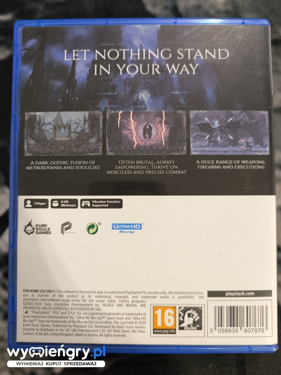 The Last Faith jest platformową grą akcji typu metroidvania. Tytuł został opracowany przez niezależne studio Kumi Souls Games, a jego powstanie było możliwe między innymi dzięki udanej kampanii crowdfundingowej w serwisie Kickstarter. The Last Faith zabiera nas w podróż do ponurej krainy fantasy, a dokładnie – do gotyckiego miasta Mythringal, będącego stolicą potężnego królestwa. Metropolią najpierw wstrząsnęła fatalna w skutkach wojna domowa; następnie padła ona ofiarą plagi, która sprowadziła ją na skraj upadku. Sprawujący tu rządy kult religijny pozostawił mieszkańców miasta na pastwę losu, aczkolwiek jeszcze nie wszystko wydaje się stracone. Sprawy w swoje ręce bierze bowiem cierpiący na amnezję Eric, który szukając odpowiedzi na pytania dotyczące antycznej przepowiedni, wplątuje się w intrygę znacznie większego kalibru. W ten sposób protagonista stopniowo odkrywa prawdę na temat zepsucia trawiącego ów świat.