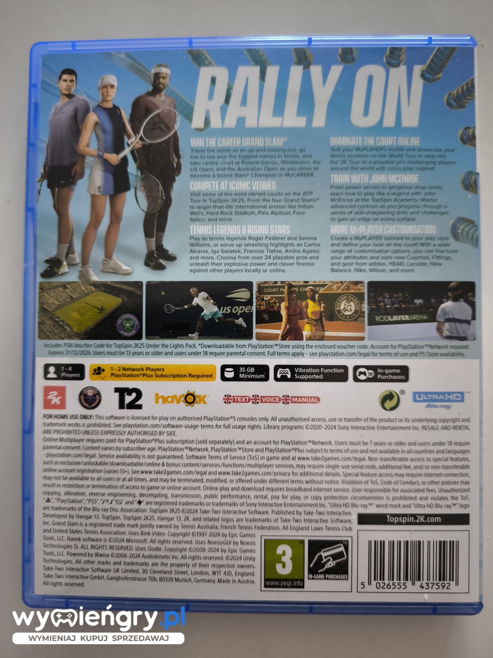 Piąta część serii tenisowych gier sportowych firmy 2K, którą zapoczątkowano w 2003 roku. W TopSpin 2K25 tworzymy własną postać lub wcielamy się w sławy tego sportu (np. Igę Świątek), biorąc udział w turniejach Wimbledon, Roland-Garros, US Open i Australian Open. Tytuł pozwala nam zarówno wcielić się w jedną z gwiazd, jak i stworzyć własnego zawodnika lub zawodniczkę w rozbudowanym kreatorze MyPLAYER. Możemy nie tylko zdecydować o płci i wyglądzie naszej postaci, lecz również o jej ubiorze, akcesoriach oraz sprzęcie od takich firm, jak adidas, HEAD, Lacoste, new Balance, Nike lub Wilson.