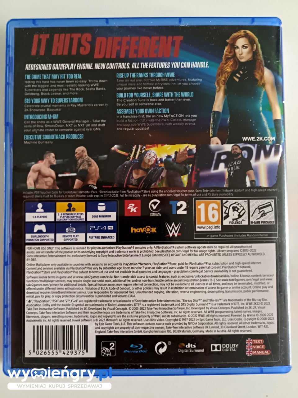 WWE 2K22 to kolejna odsłona serii gier sportowych WWE 2K. Tytuł wyprodukowało studio Visual Concepts znane głównie z cyklu NBA 2K, a wydaniem zajęła się firma 2K Sports od 2013 roku odpowiedzialna za wrestlingowe 2K. Podczas rozgrywki na ringu spotykamy się z licznymi gwiazdami tego sportu (takimi jak: The Rock, Sasha Banks czy Brock Lesnar), których sylwetki zostały dokładnie odwzorowane. W grze znajdziemy tryby pojawiające się we wcześniejszych odsłonach, ale także zupełne nowości. Główną atrakcją jest oczywiście branie udziału w walkach na ringu, przy wykorzystaniu widowiskowych ciosów, chwytów, rzutów i specjalnych ataków, charakterystycznych dla wrestlingu. W tych potyczkach możemy przejąć kontrolę nad sławnymi zawodnikami. Oprócz tego mamy możliwość zapoznania się ze światem WWE od strony organizacyjnej - wcielenia się w menadżera drużyny lub wydarzeń sportowych. Opracowanie najlepszego programu, z najbardziej emocjonującymi i widowiskowymi walkami jest naszym głównym celem w tym trybie MyGM, a wybieranie zawodników, umawianie meczów w module MyFACTION.